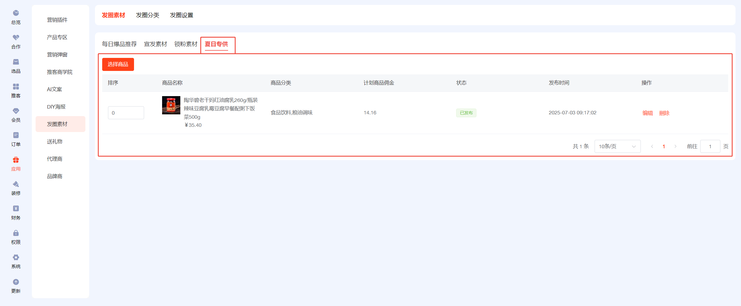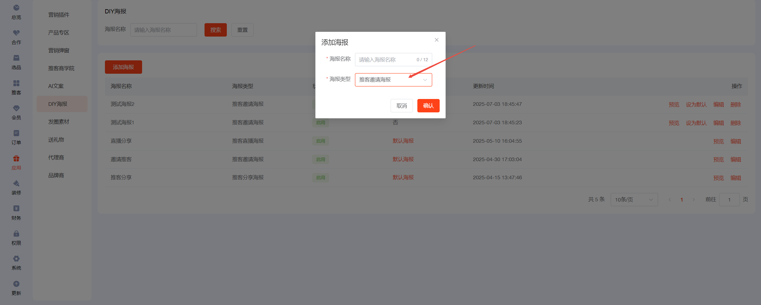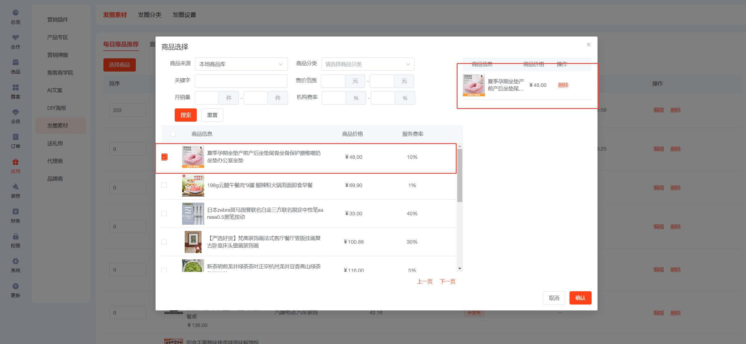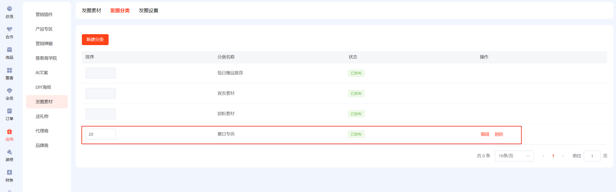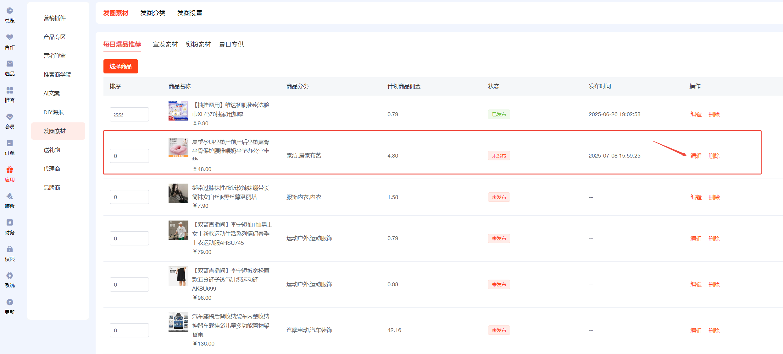 ## 一、前往AI文案,开启AI设置,填写deepseek的key值 ## 二、设置【发圈设置】 先去小程序公众后台添加服务器域名 https://wst.wxapp.tc.qq.com https://store.mp.video.tencent-cloud.com 本次更新小程序公众后台需添加到服务器域名中 小程序后台登录链接:https://mp.weixin.qq.com/   填写发圈人昵称,上传发圈头像  ## 三、发圈素材分三类:商品发圈素材、宣发素材、锁粉素材 ## 四、商品发圈素材:文案+图片+商品链接(商品链接可帮助推客锁粉) 选择添加发圈商品  添加到列表后,进入编辑  开启上架,点击deepseek一键生成,保存  ## 五、宣发素材:文案+图片 添加素材,自己自定义生成提示语,用AI生成推广文案,自定义上传图片  ## 六、锁粉素材:文案+海报(海报中的二维码可帮助推客锁粉) 在DIY海报应用中,新建海报,选择海报类型为【推客邀请海报】  锁粉素材中新建素材,填写生成提示语生成文案,选择海报模板(可多选)  ## 七、发圈分类 每日爆品推荐、宣发素材、锁粉素材为固定发圈分类,不可更改且不能排序 新建的自定义发圈分类,为商品分类   ## 八、如何链接 1、可在装修--底部导航--新增【发圈】菜单,选择链接【发圈素材】 2、可在装修中,图文导航的按钮链接到【发圈素材】