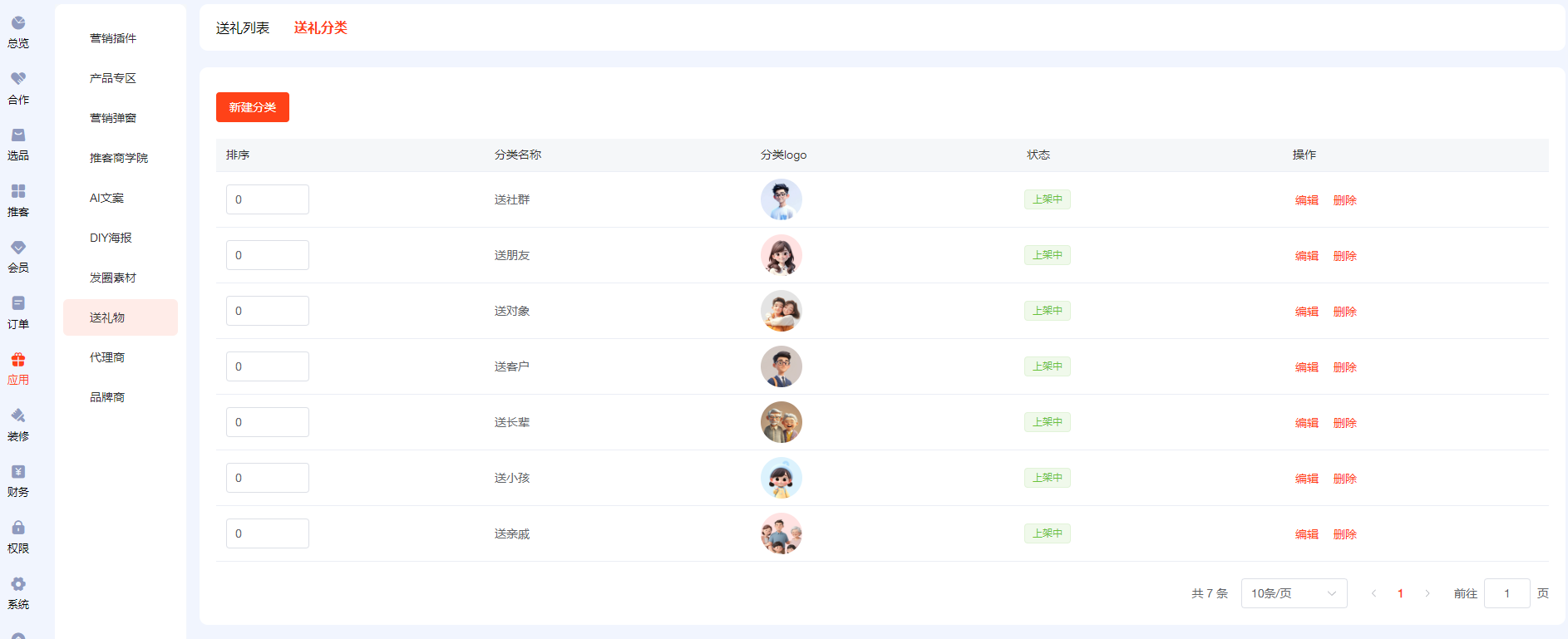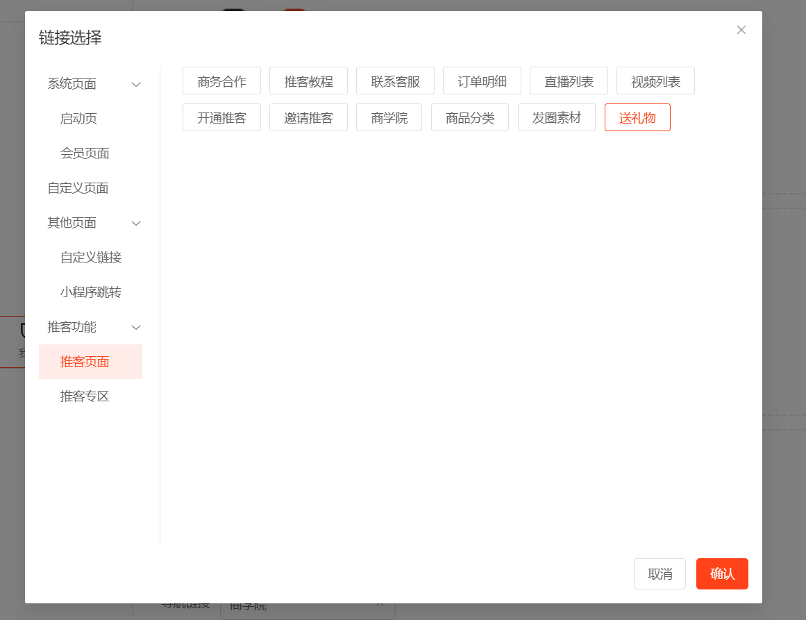 ## 一、送礼物分类已默认建好,也可自定义修改 新建分类,分类图可在图片库的系统图片中选择,也可全部自定义上传   ## 二、在分类中添加商品  ## 三、如何链接 1、可在装修--底部导航--新增【送礼物】菜单,选择链接【送礼物】 2、可在装修中,图文导航的按钮链接到【送礼物】