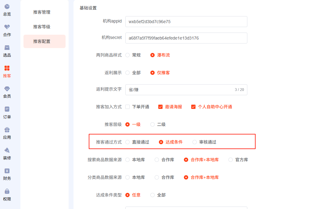 ### 一、推客如何邀请别人成为下级推客 #### 1、分享小程序 #### 2、商品详情页中生成的商品海报 #### 3、商品详情页AI生成的商品链接 #### 4、商品发圈素材中,复制评论(商品链接) #### 5、锁粉素材中的二维码推广海报 #### 6、个人中心邀请好友按钮生成的海报 ### 二、客户搜索小程序系统绑定关系 #### 若A自己搜索进入小程序(不管有没有成为推客),他的上级为平台,后续无论哪个推客再转发邀请,都不能与他绑定上下级 ### 三、非推客身份关系 #### 若A(不是推客),邀请B(不是推客),不能绑定上下级 ### 四、双方都是推客身份关系 #### 若A是推客,B也是推客,两者没有上下级关系,后A转发商品给B,B购买,A无佣金 ### 五、非‘直接通过’设置,推客身份系统绑定关系  #### 若设置达成条件成为推客,A申请合作了,但是还未完成条件,此时不算推客,转发小程序给B,无法与B绑定上下级