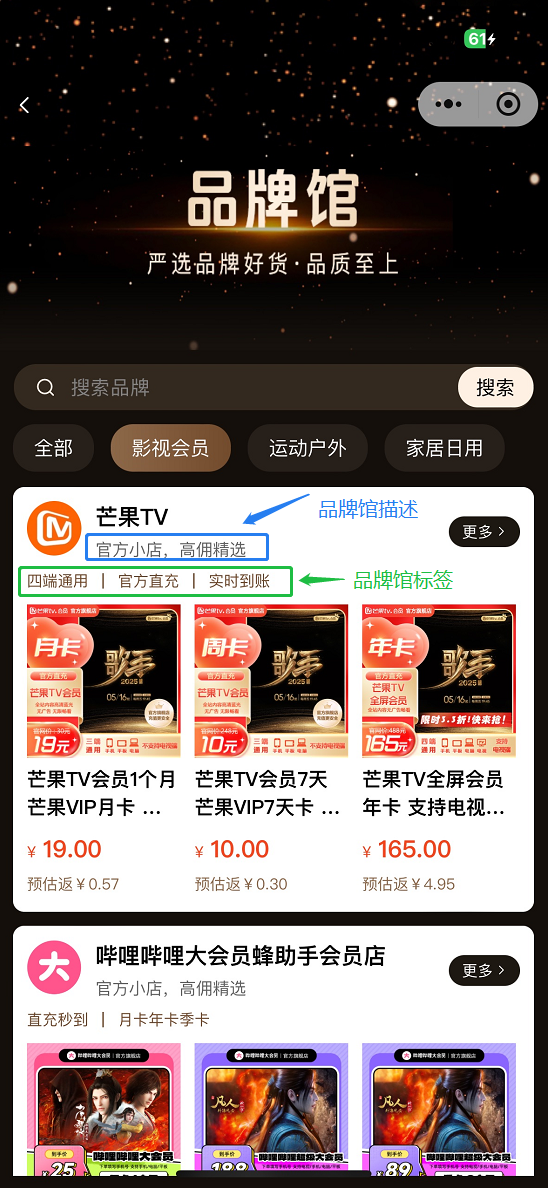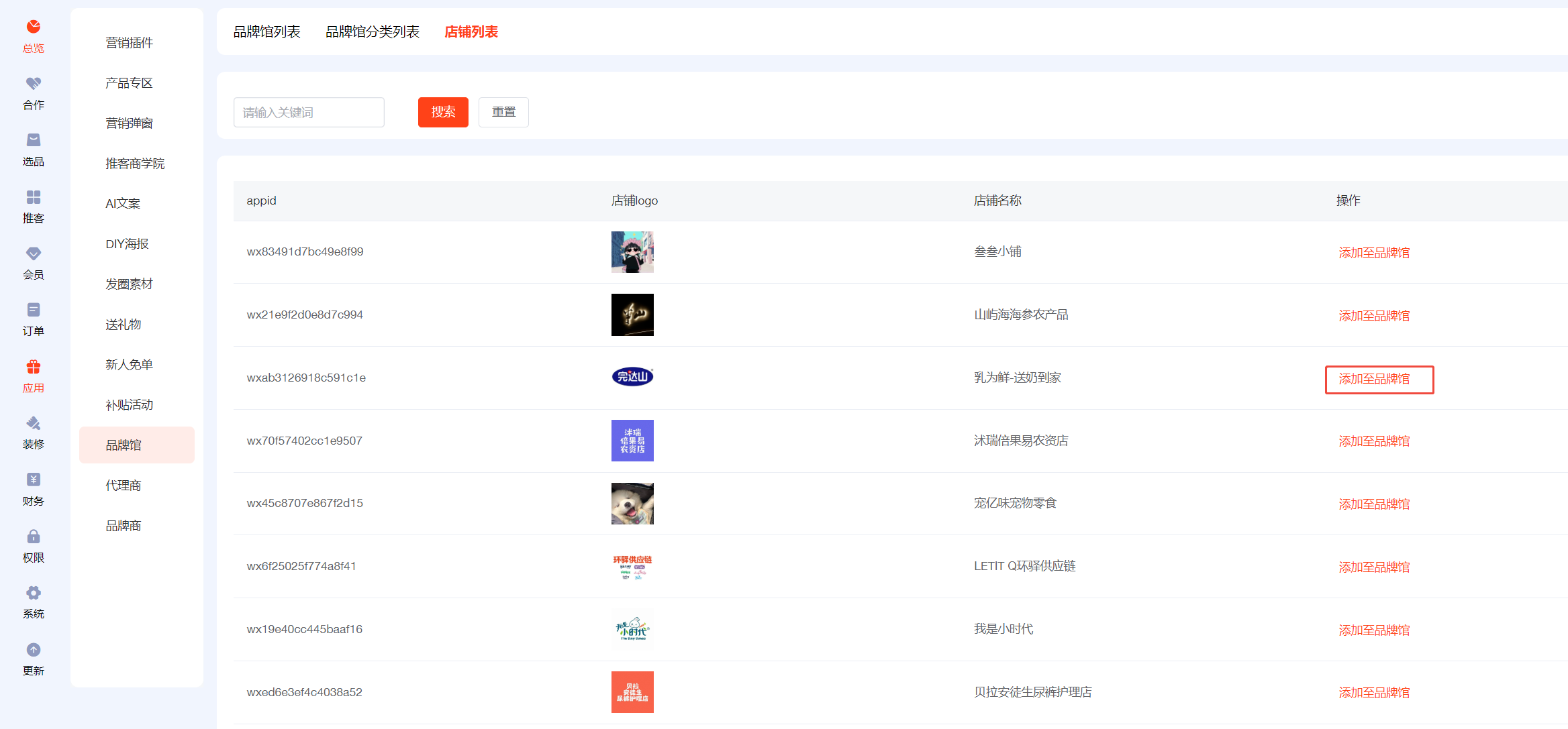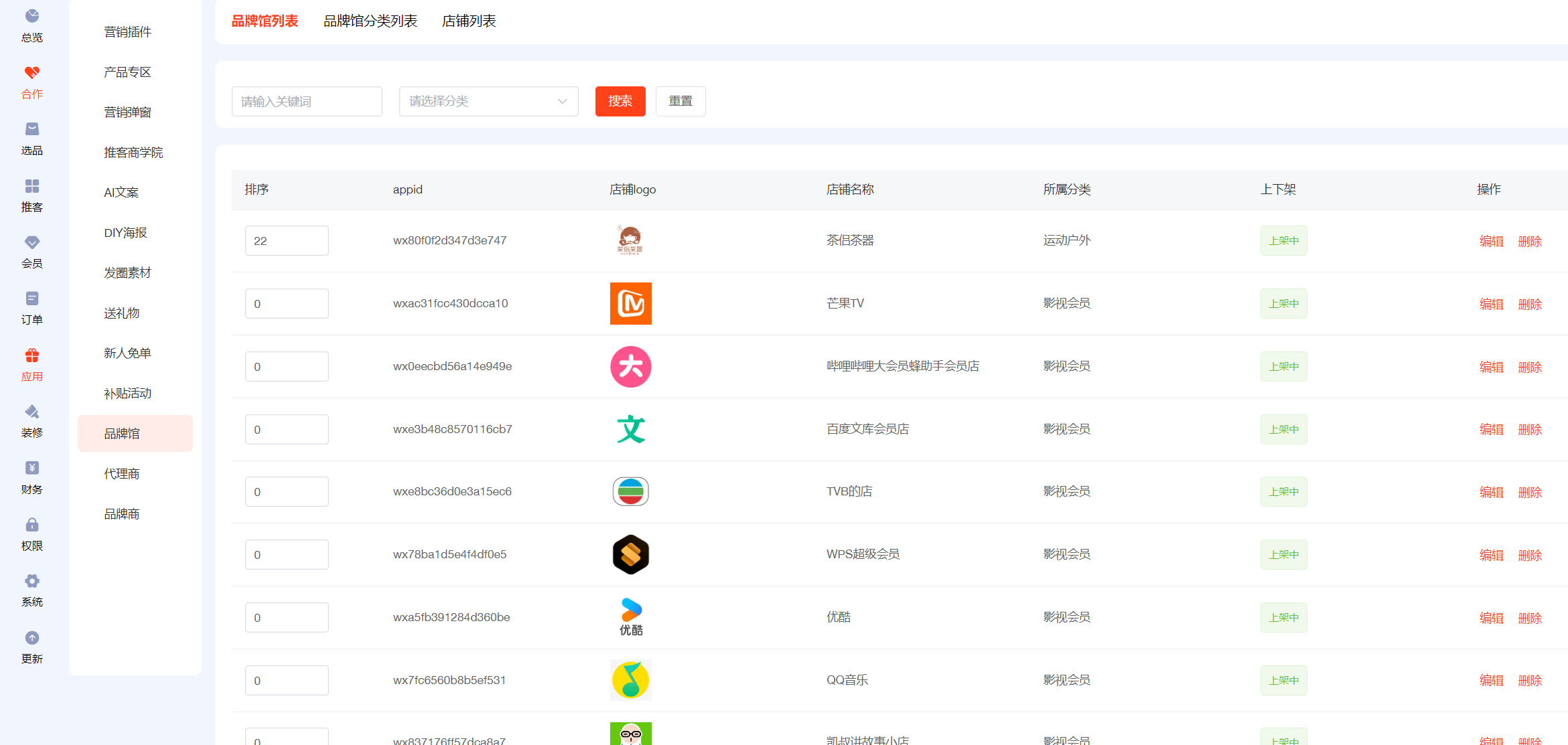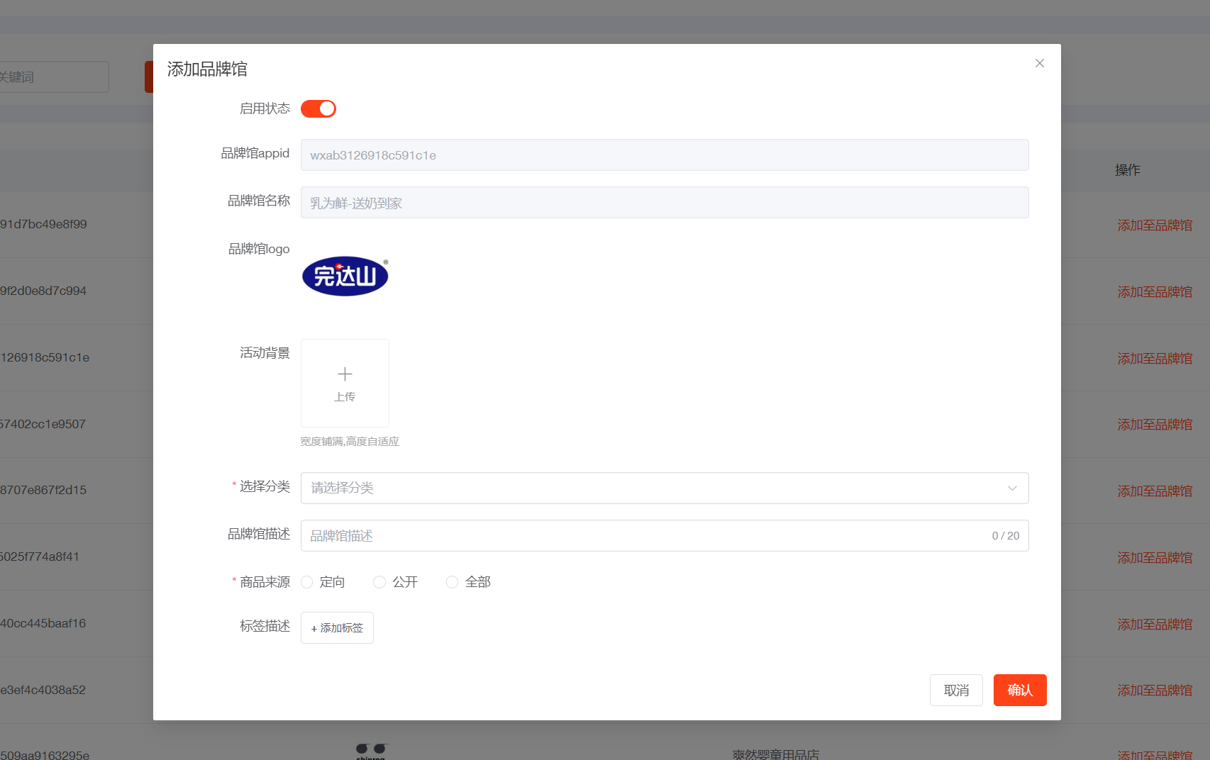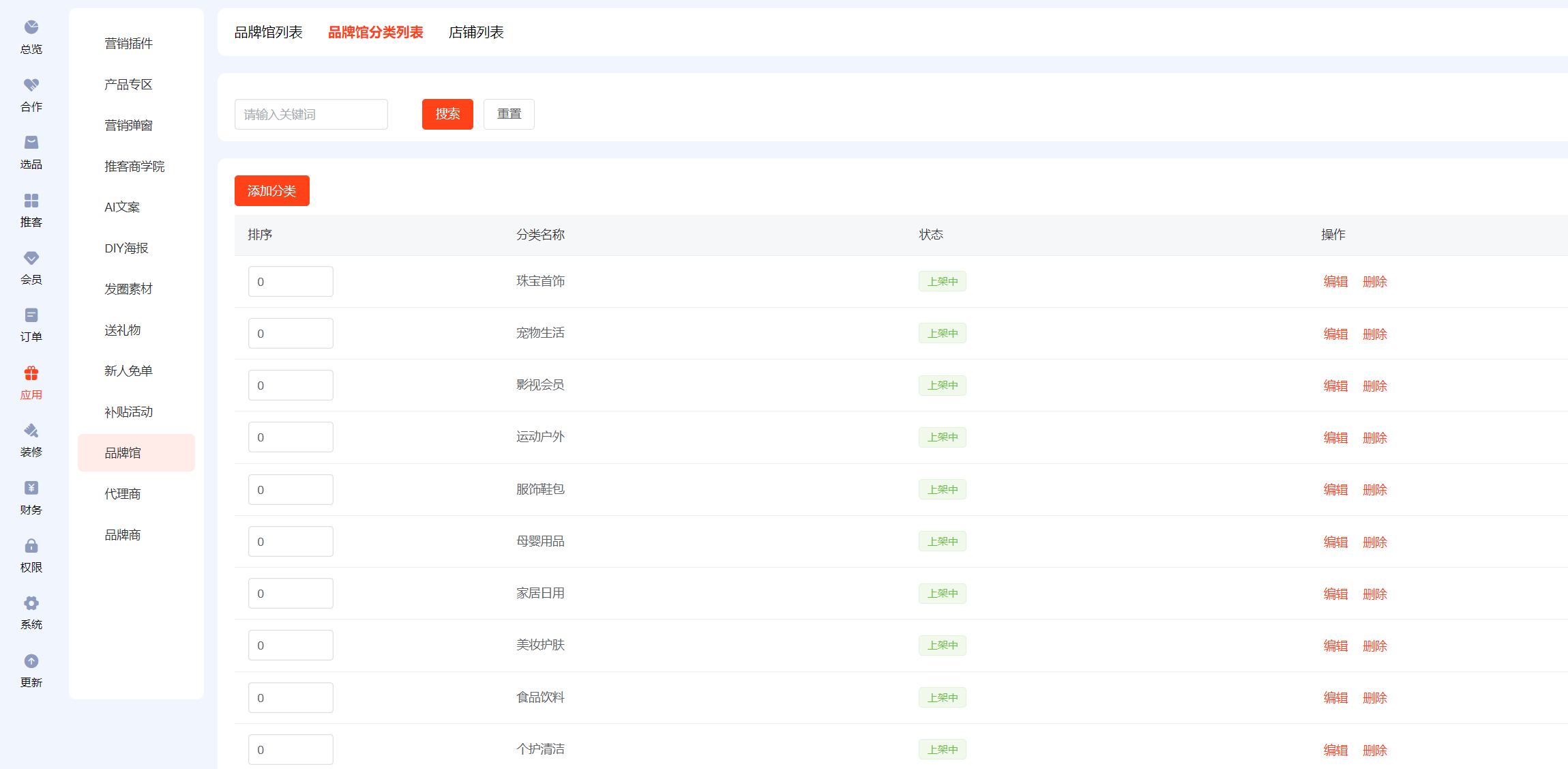 ### 品牌馆分类 添加自己的品牌馆分类  ### 店铺列表 在店铺列表中添加所需的店铺至品牌馆  活动背景是品牌店商品列表页的头图,可自由上传,宽度750px,高度尽量大于400px,不上传则不显示  标签可添加多个,展示如下  ### 品牌馆列表 可设置排序、上下架,编辑内容
