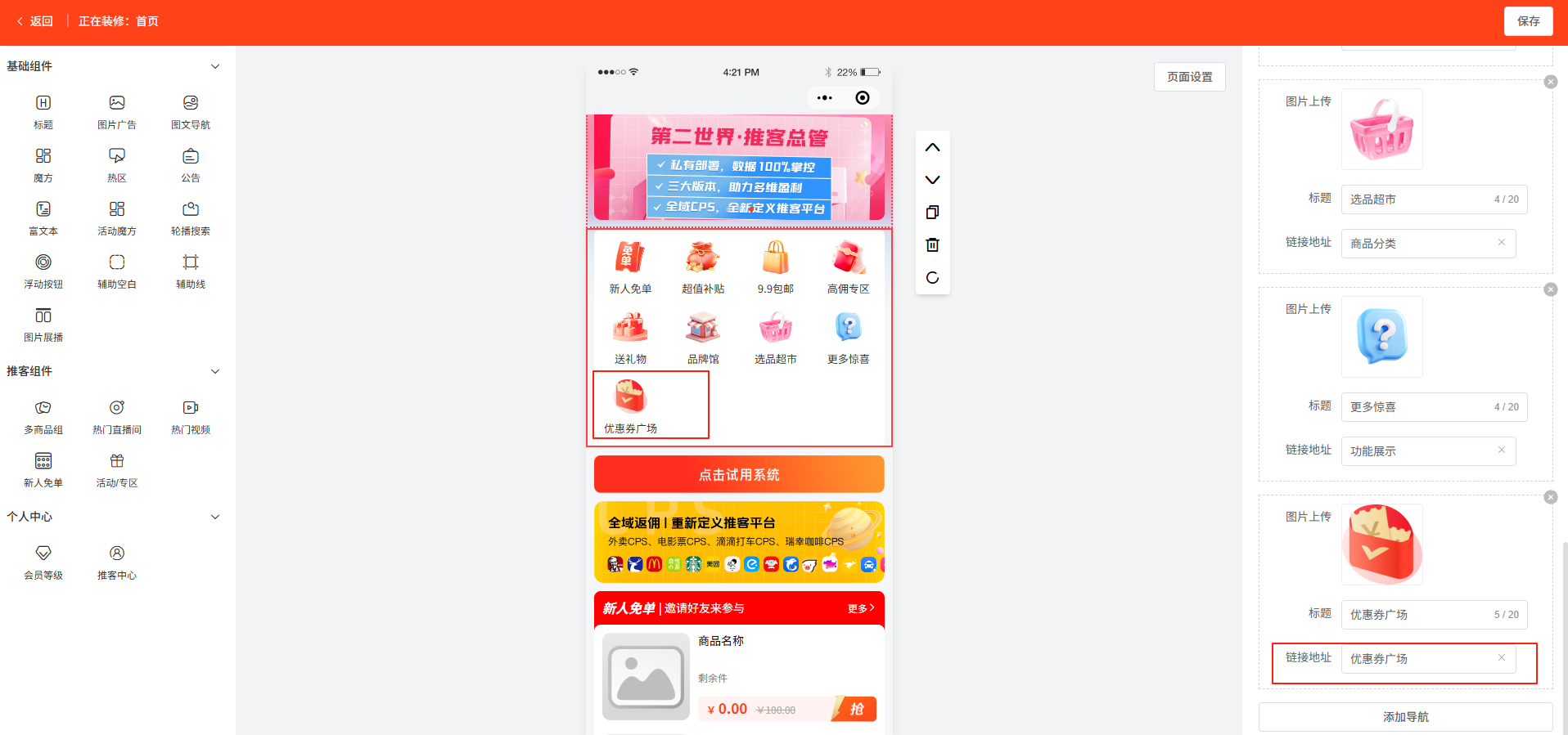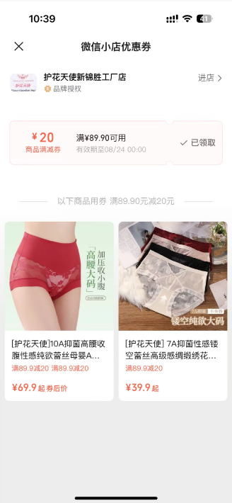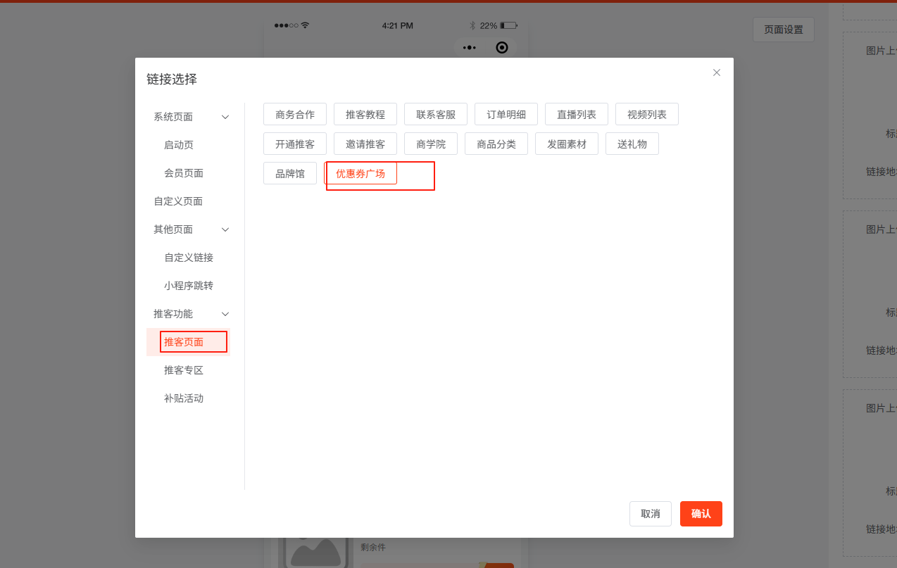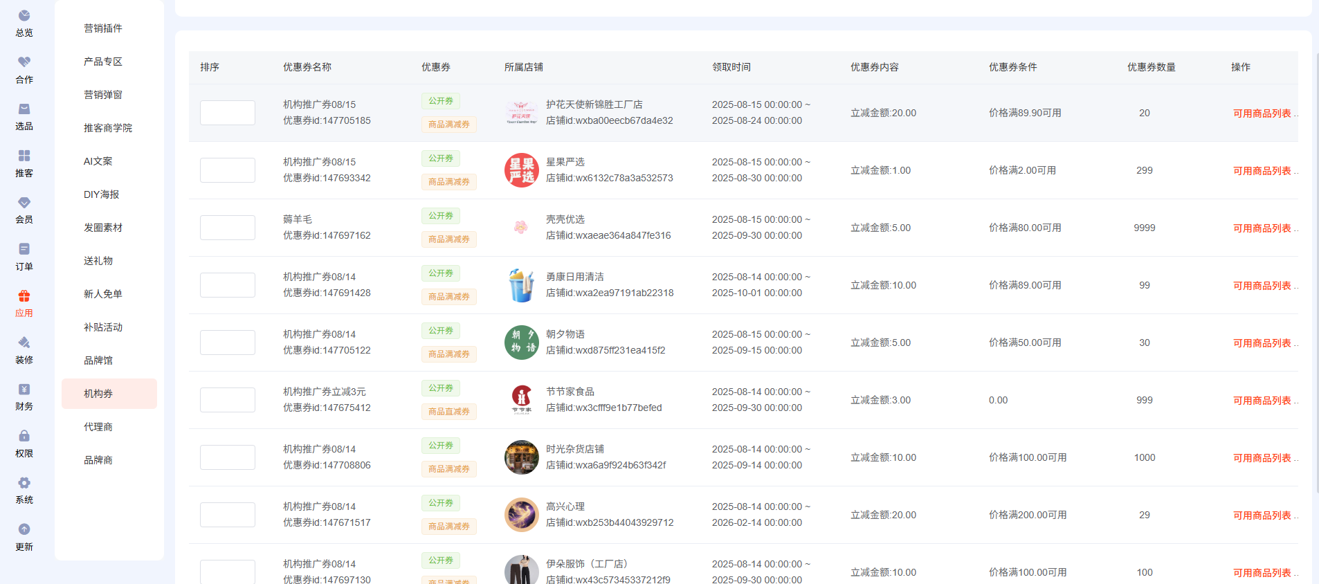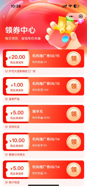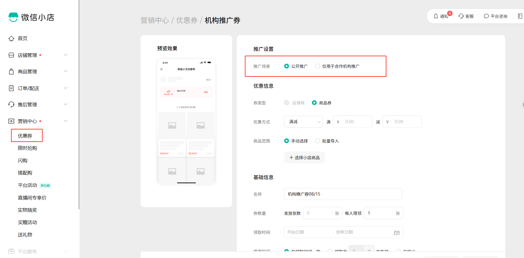 ### 同步调用微信小店营销中心优惠券功能 #### 1.微信小店创建优惠券  #### 分公开推广 和定向机构推广优惠券,机构都能获取到,创建完成之后,合作的机构能同步拿到该小店设置的优惠券  ### 2.系统设置优惠券广场  #### 自定义填加模块,可以在首页、底部,个人中心都可创建链接优惠券广场  ### 3.小程序使用场景 #### 领取优惠券  #### 优惠券可使用的商品