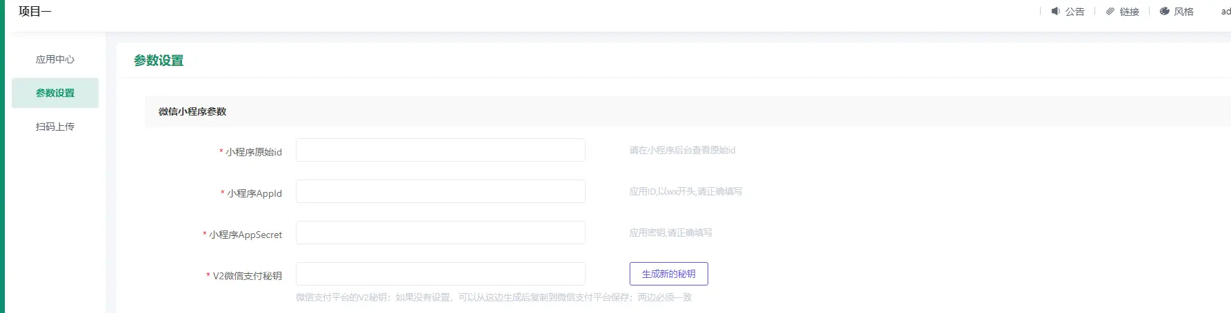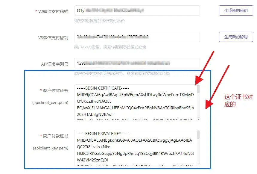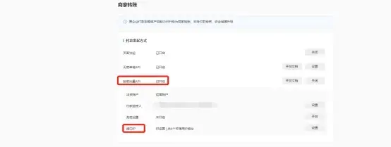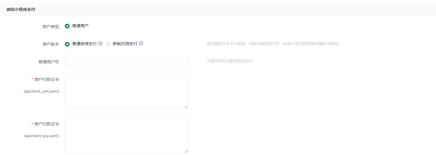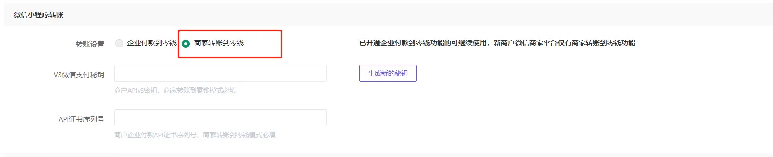 ### 1、微信小程序参数【填写小程序信息】 填写的小程序 需与 授权小程序一致  ### 2、微信小程序支付 微信支付配置流程:https://www.kancloud.cn/worldidc/sph_1/3205519  ### 3、微信小程序转账 #### 商家转账到零钱 已开通企业付款到零钱功能的可继续使用,新商户微信商家平台仅有商家转账到零钱功能 选择 “商户转账到零钱” 必须设置V3微信支付秘钥 以及 填入API证书序列号  #### 获取API证书序列号获取API证书序列号 注意选择后台企业付款证书对应的序列号   #### 完善免密设置、接口IP  开启验密批量API,将服务器ip添加到接口IP设置 若需要免密操作可开启免密设置并设置免密额度 若不设置免密,则每一笔打款都需管理员微信密码确认后才可转出 设置免密金额,例如100元,低于免密金额的款项可直接转出