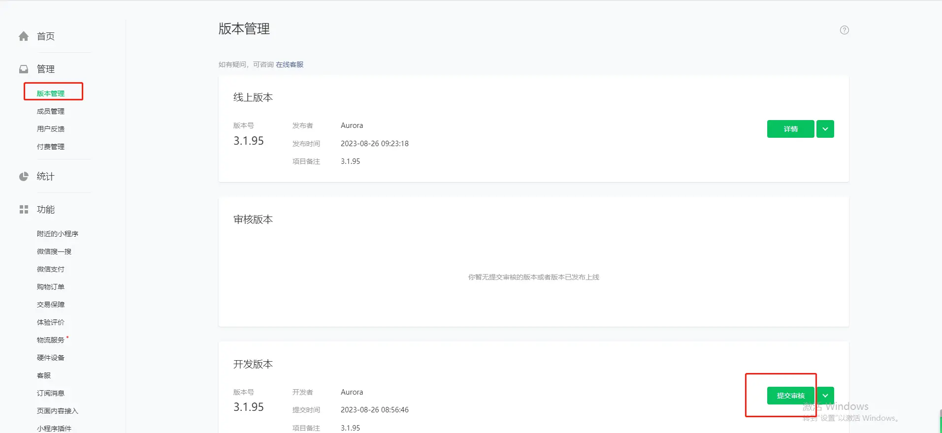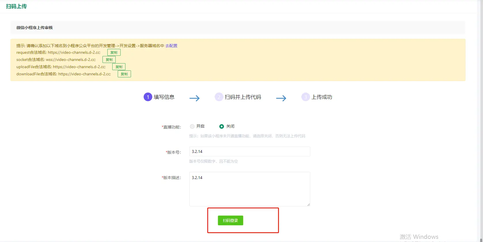 ### 微信小程序参数配置完成后扫码上传代码   ### 扫码上传成功后进入微信公众平台—版本管理内提交审核,审核通过后发布上线 微信公众平台登录地址:https://mp.weixin.qq.com