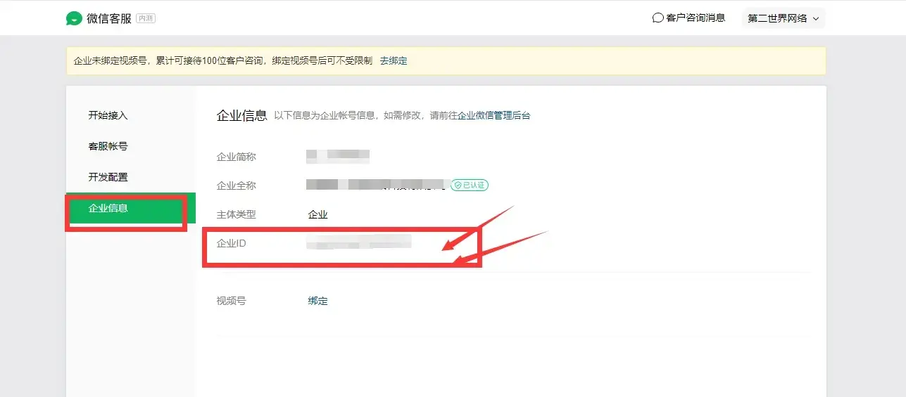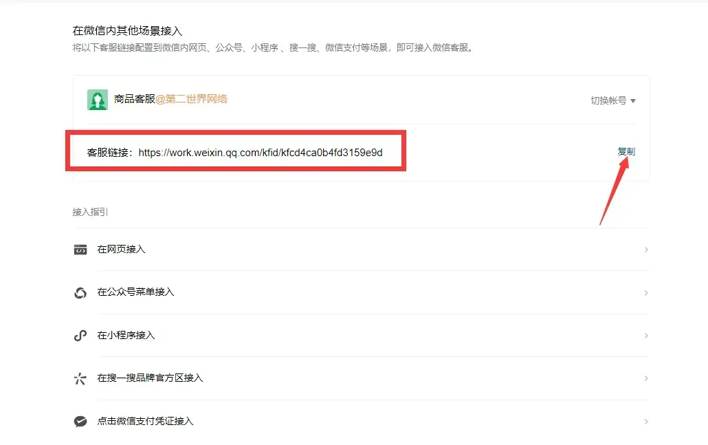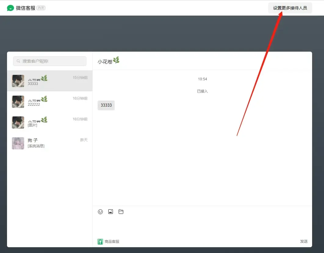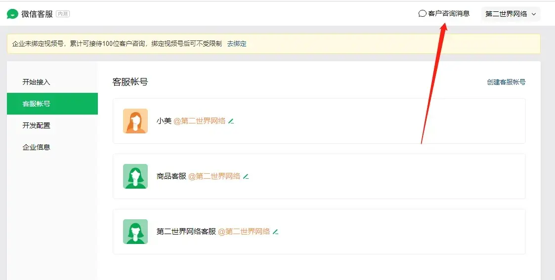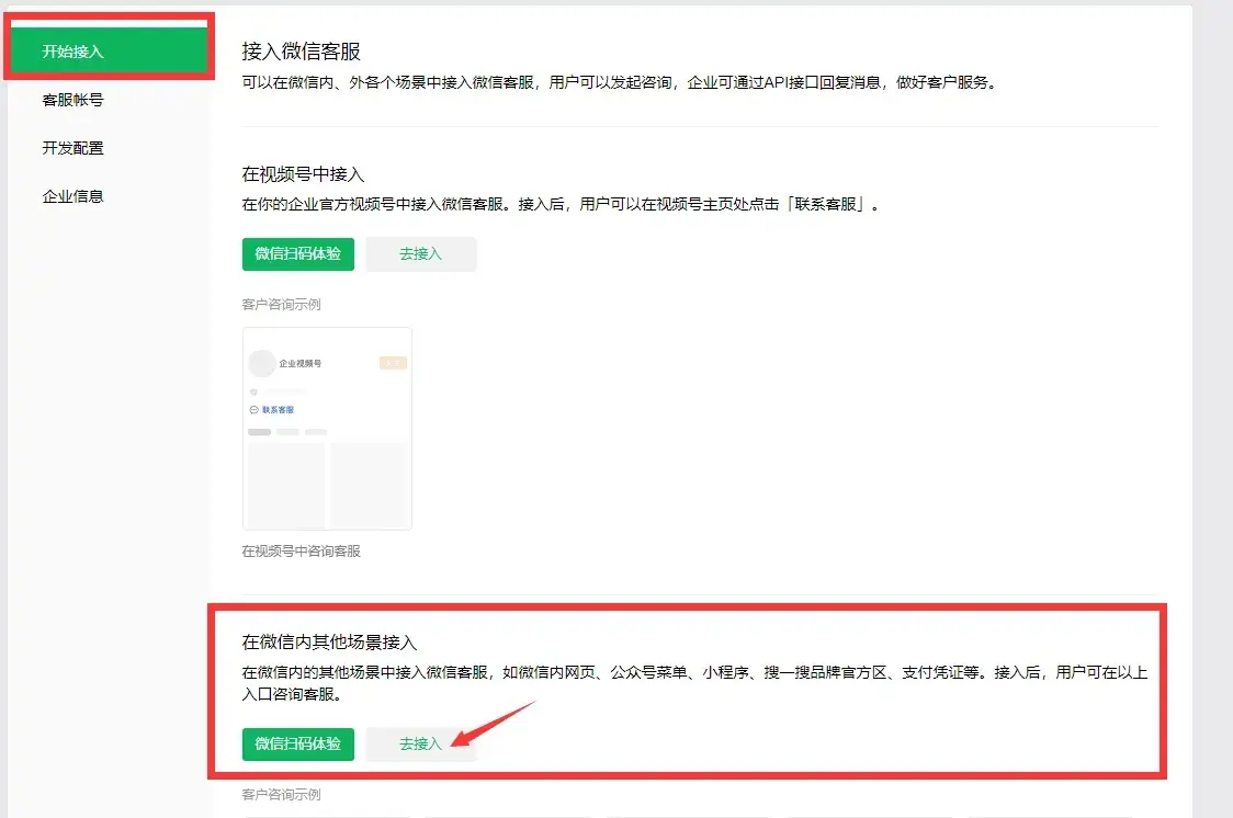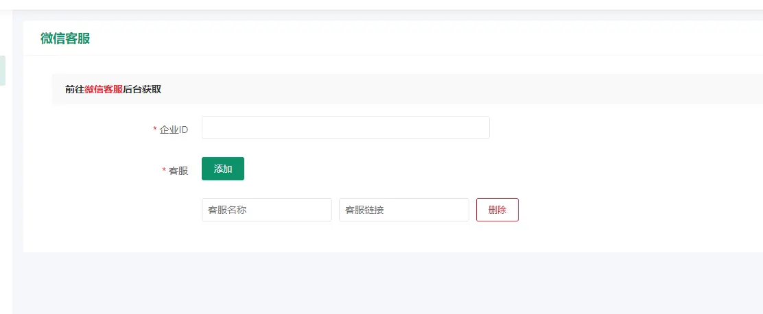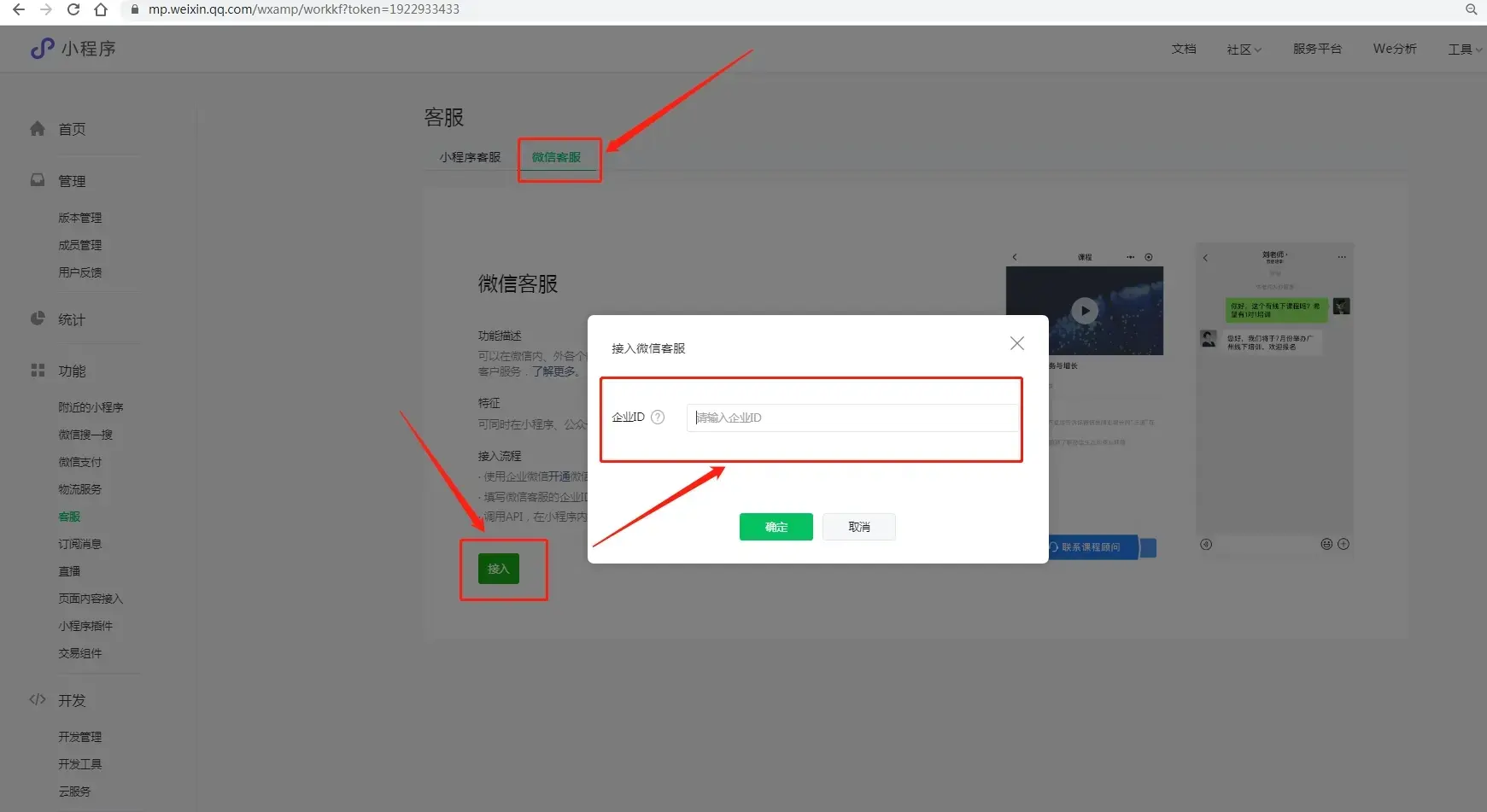 考虑到用户会在企业的小程序里联系客服,为此支持在小程序里接入微信客服,用户点击后即可打开对应的微信客服会话,发起客服咨询。 该功能已向非个人的全体小程序开放,小程序开发者在小程序管理后台处,绑定同主体的微信客服(企业ID)后,即可调用小程序相关接口,接入微信客服。 ### 接入微信客服 企业微信管理员扫码登录微信客服平台:https://work.weixin.qq.com/kf 1、获取企业ID  2、公众平台小程序后台:客服-微信客服,绑定企业ID,并接入微信客服账号;    3、获取客服链接    4、分配客服接待人员(接待人员必须是企业微信你的企业里的人员)      ### 系统后台(应用—微信客服) 微信客服后台:https://kf.weixin.qq.com/