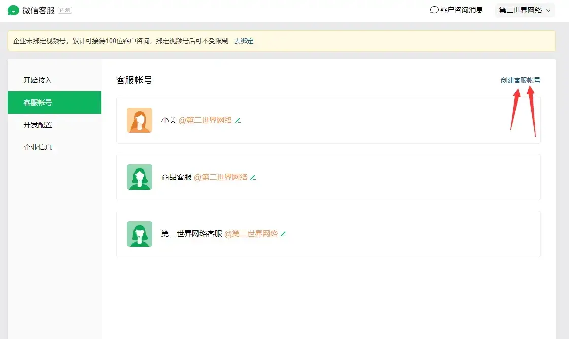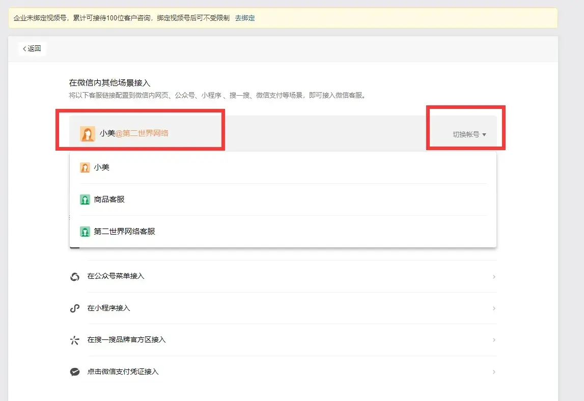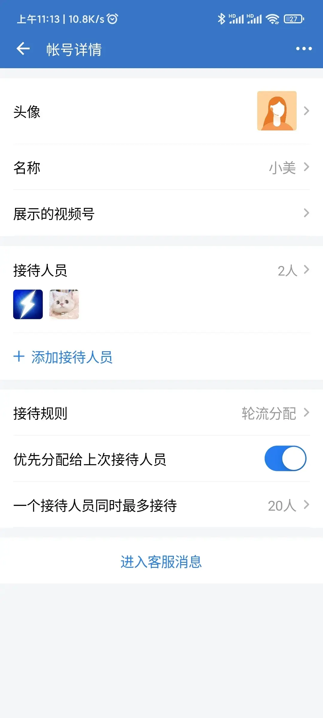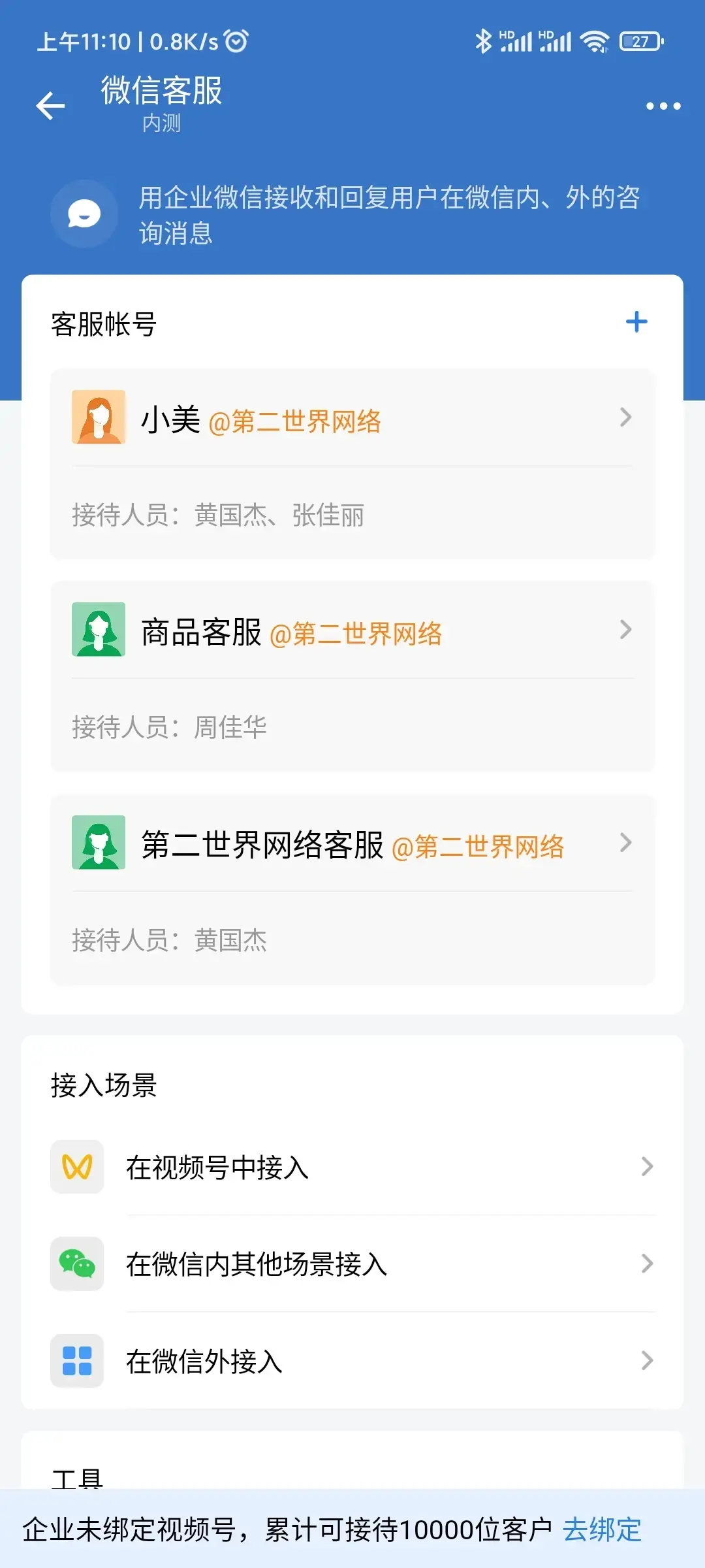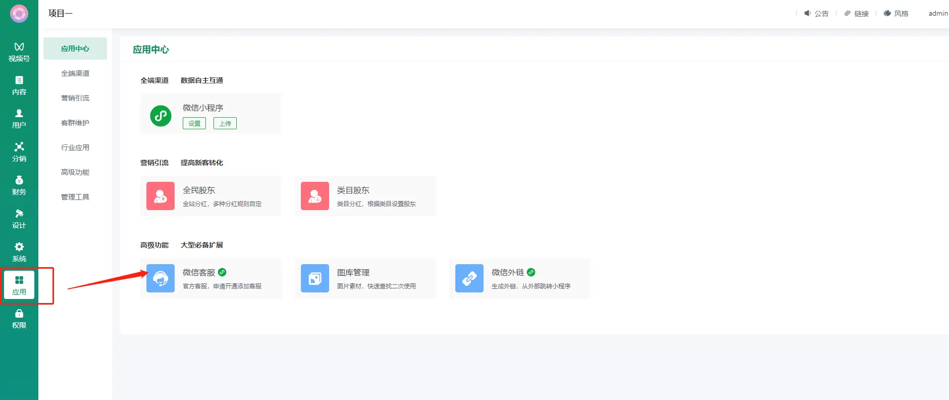 考虑到用户会在企业的小程序里联系客服,为此支持在小程序里接入微信客服,用户点击后即可打开对应的微信客服会话,发起客服咨询。 该功能已向非个人的全体小程序开放,小程序开发者在小程序管理后台处,绑定同主体的微信客服(企业ID)后,即可调用小程序相关接口,接入微信客服。 ### 接入微信客服 企业微信管理员扫码登录微信客服平台:https://work.weixin.qq.com/kf 1、获取企业ID  2、公众平台小程序后台:客服-微信客服,绑定企业ID,并接入微信客服账号;    3、获取客服链接    4、分配客服接待人员(接待人员必须是企业微信你的企业里的人员)      ### 系统后台(应用—微信客服) 微信客服后台:https://kf.weixin.qq.com/