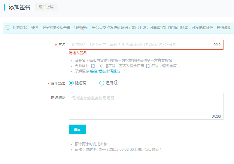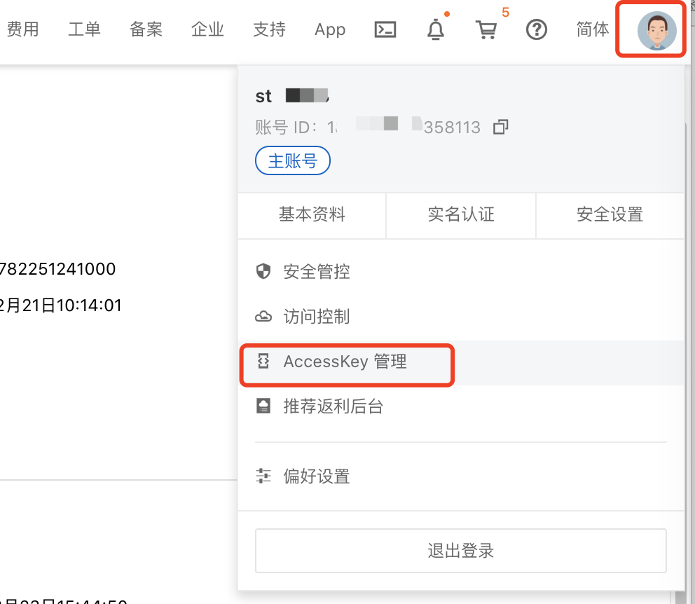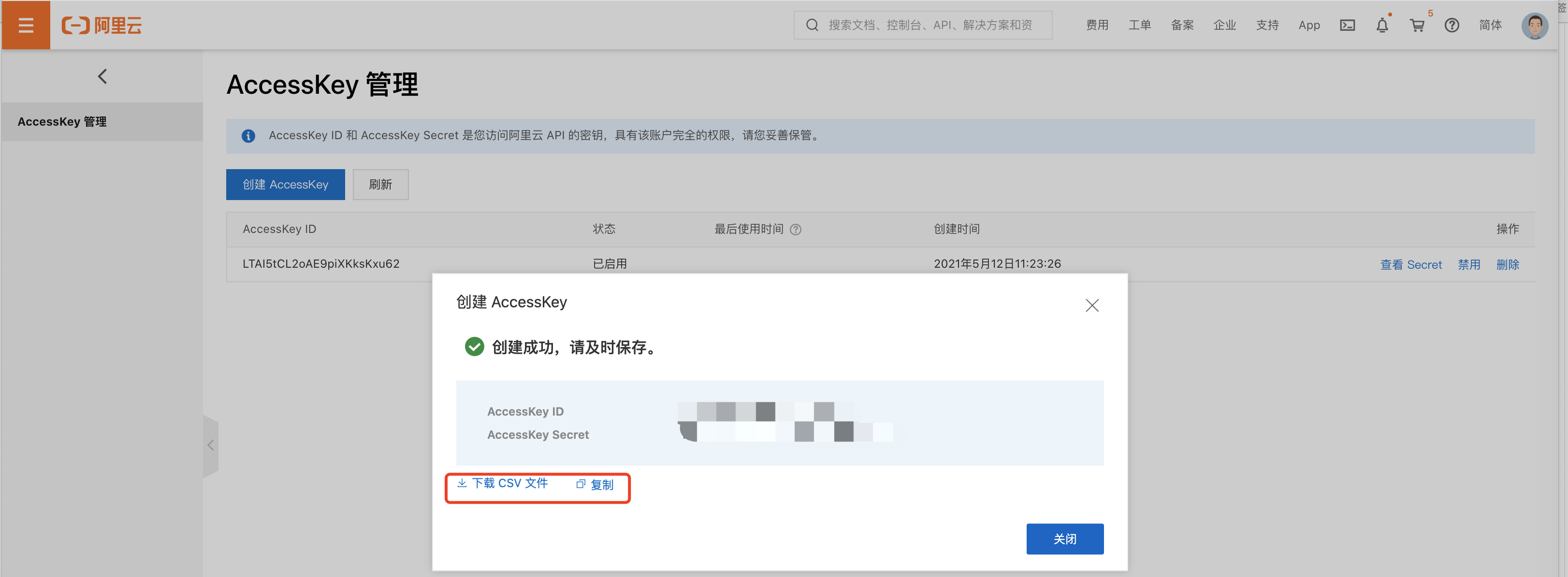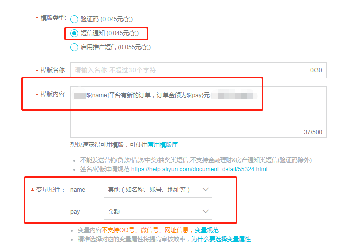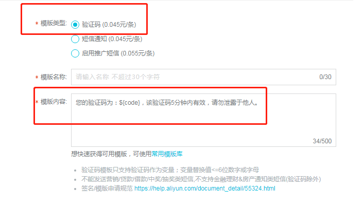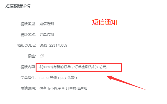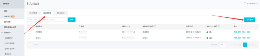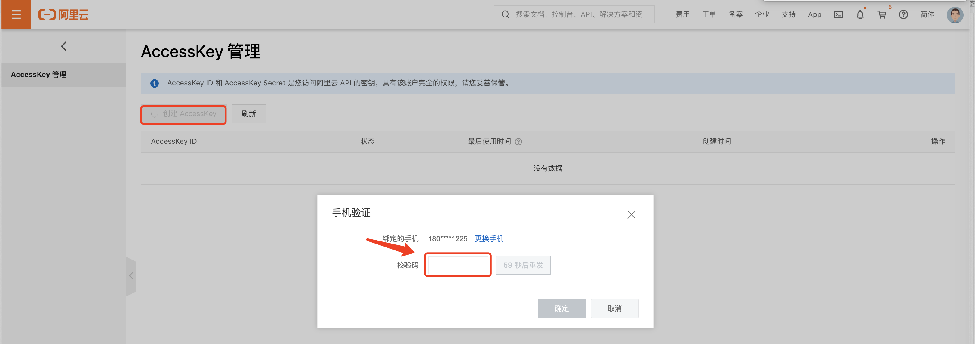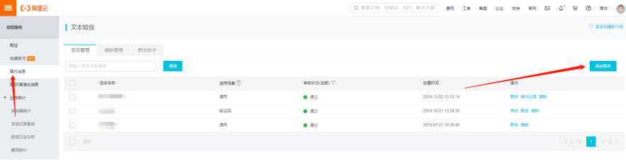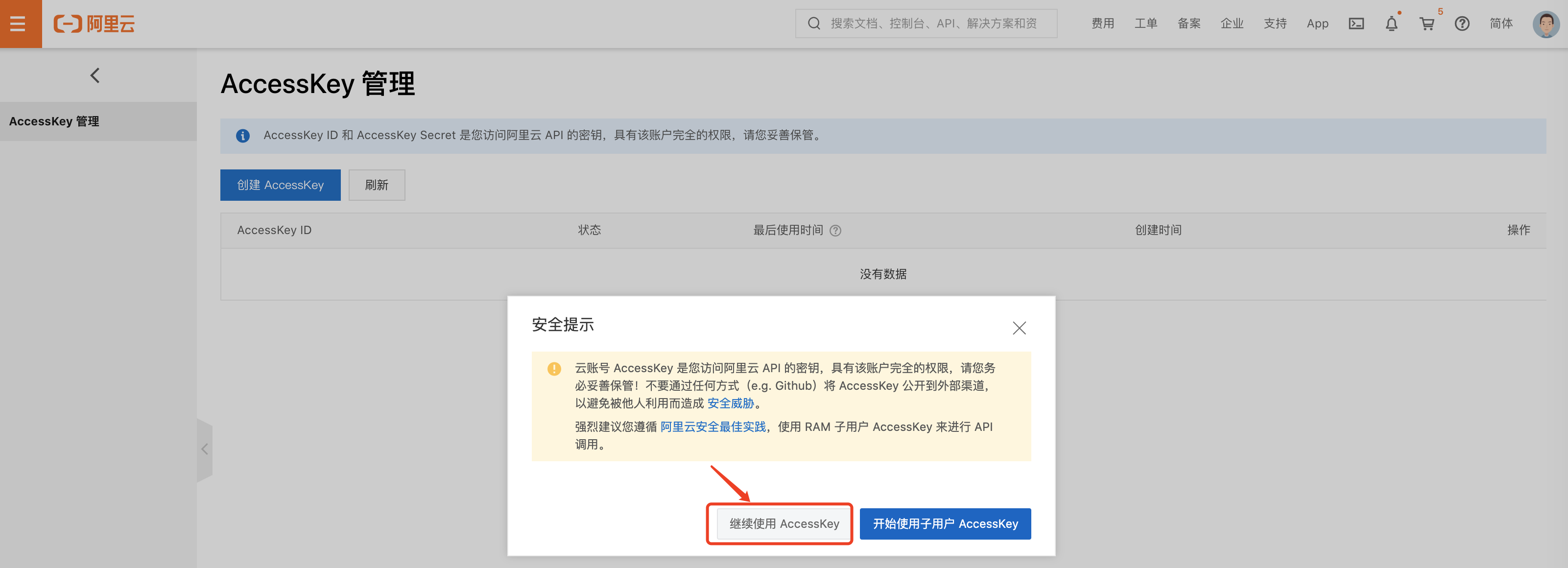 ## 全端云短信配置 . 阿里云短信 . **可参考官方文档:https://help.aliyun.com/zh/sms/?spm=a2c4g.11186623.0.0.2d406f22DLFQyr** ### 两种模板:绑定手机号码获取验证码、订单通知; **1、手机验证码模板:您的验证码为:${code},该验证码5分钟内有效,请勿泄漏于他人!**  **2、订单通知模板:${name}有新的订单,订单金额为${pay}元;**  ### 阿里云短信配置步骤:  **1、添加签名:签名管理 - 添加签名;**   **2、添加模板:模板管理 - 添加模板;**  **验证码:**   **短信通知:**   ### <br>**如何获取短信短信AccessKeyID和短信AccessKeySecret** 1、将鼠标移至右上方的账号管理图标,然后单击【Accesskeys 管理】。如下图所示:  2、单击继续使用AccessKey。如下图所示:  3、如果列表中已AccessKey点击查看查看 Secret,如果没有单击【创建AccessKey】,完成手机验证后就可以创建AccessKey ID和AccessKey Secret。如下图所示:  4、AccessKey创建成功后,<span style="color: red">AccessKey ID 和 AccessKey Secret 是您访问阿里云 API 的密钥,具有该账户完全的权限,请您妥善保管。  注意:请勿通过任何方式(如Github等)将AccessKey公开至外部渠道,以免被恶意利用而造成安全威胁。强烈建议您遵循阿里云安全最佳实践,使用RAM子用户AccessKey来进行API调用。