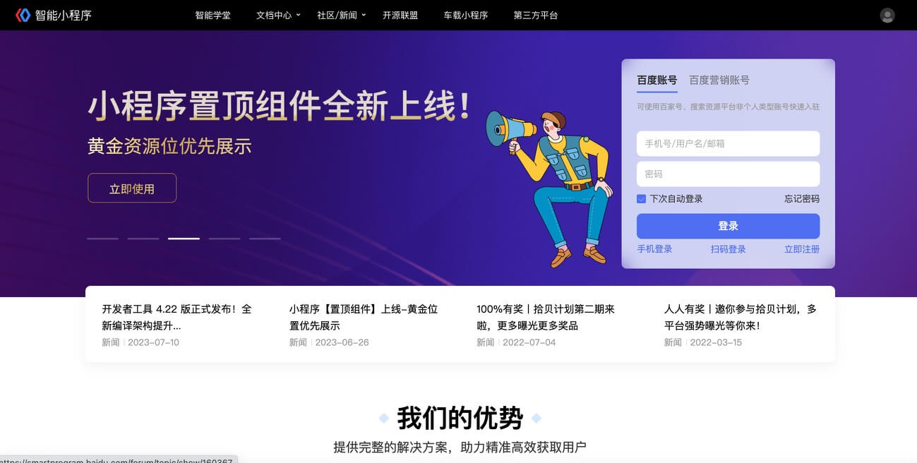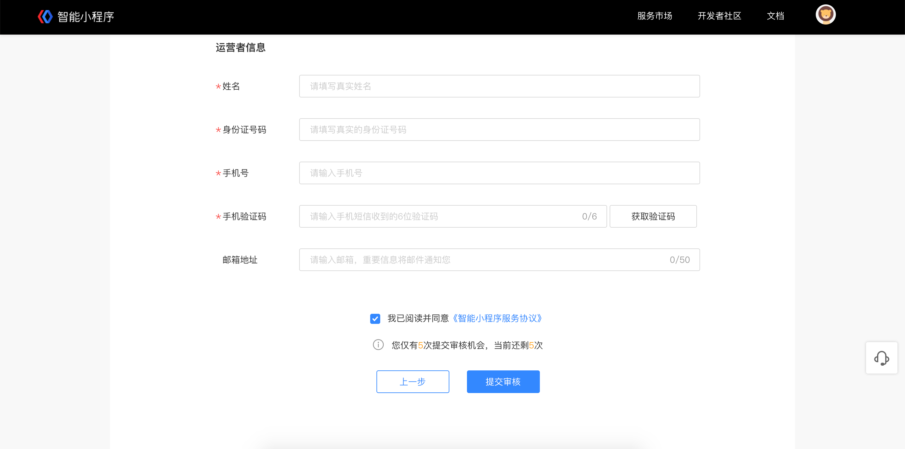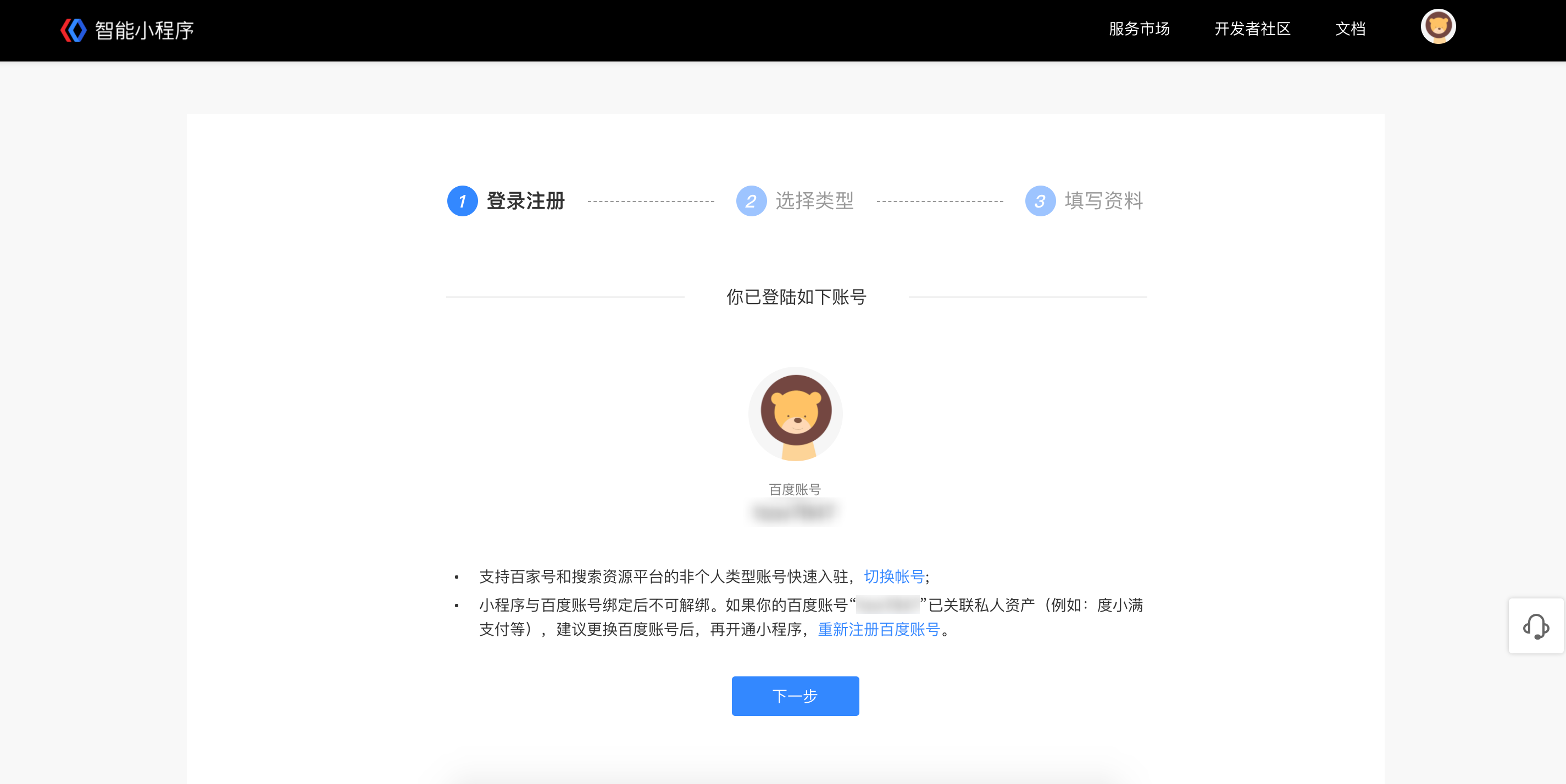 **可参考官方文档:https://smartprogram.baidu.com/docs/introduction/enter_application/** ### 登录注册 打开[智能小程序官网](https://smartprogram.baidu.com/mappconsole/main/login "智能小程序官网")首页,点击右上方“登录”按钮。目前支持百度账号及百度商业账号登录,企业账户建议选用百度商业账号进行登录。  ### 主体认证 #### 主体类型选择 登录成功后,点击“下一步”进入主体信息提交环节,主体认证通过后就可以创建智能小程序。   #### 主体信息填写 ##### 1、填写企业信息  ##### 2、填写运营者信息  ##### 3、填写完成后请点击提交,等待审核  ### 真实性认证 真实性认证入口:登录[智能小程序平台](https://smartprogram.baidu.com/developer/index.html "智能小程序平台"),单击顶部导航『管理中心』进入小程序管理界面,如下图所示:  针对各主体类型的特性,提供以下不同的验证方式,可以根据主体特性任选一种: