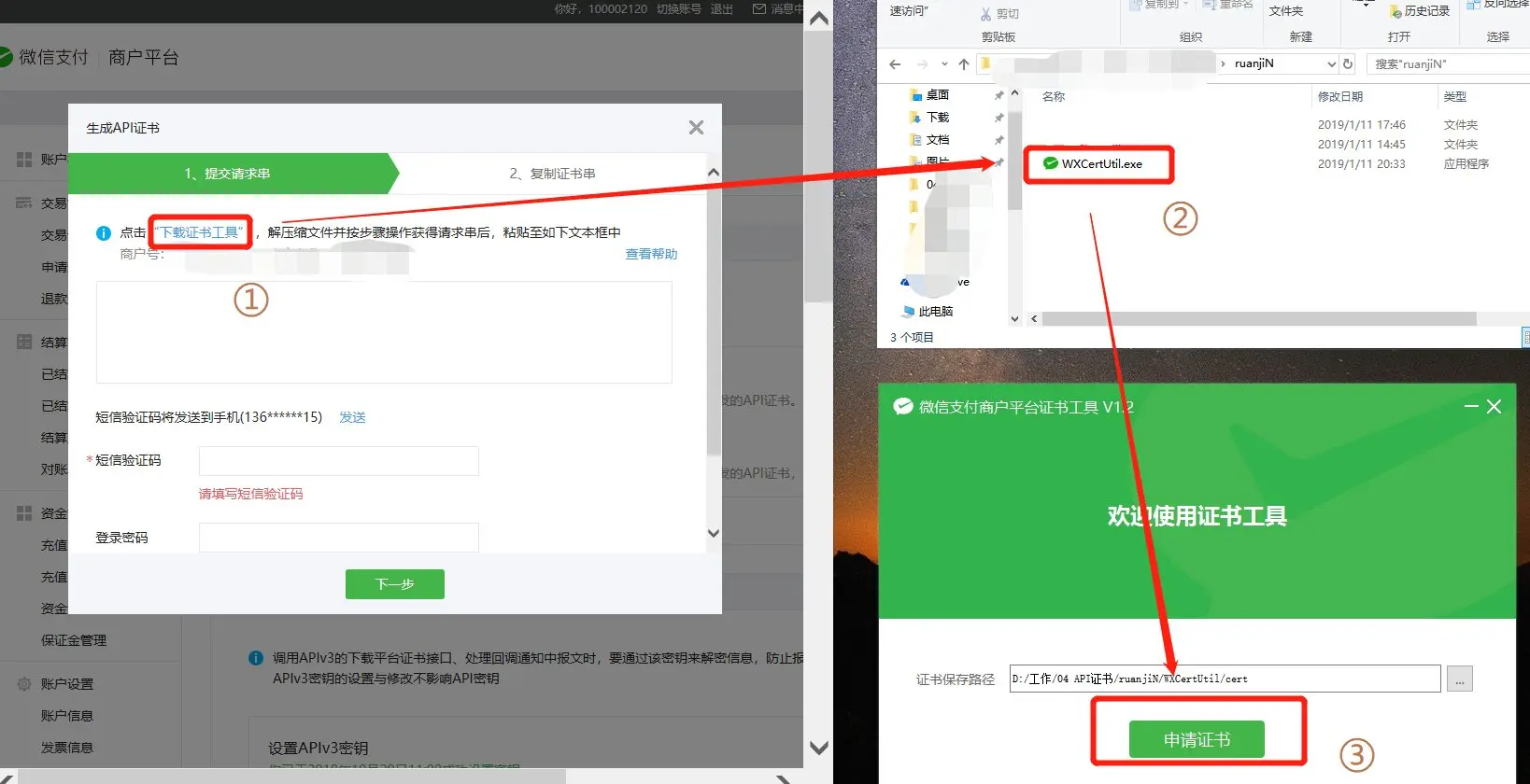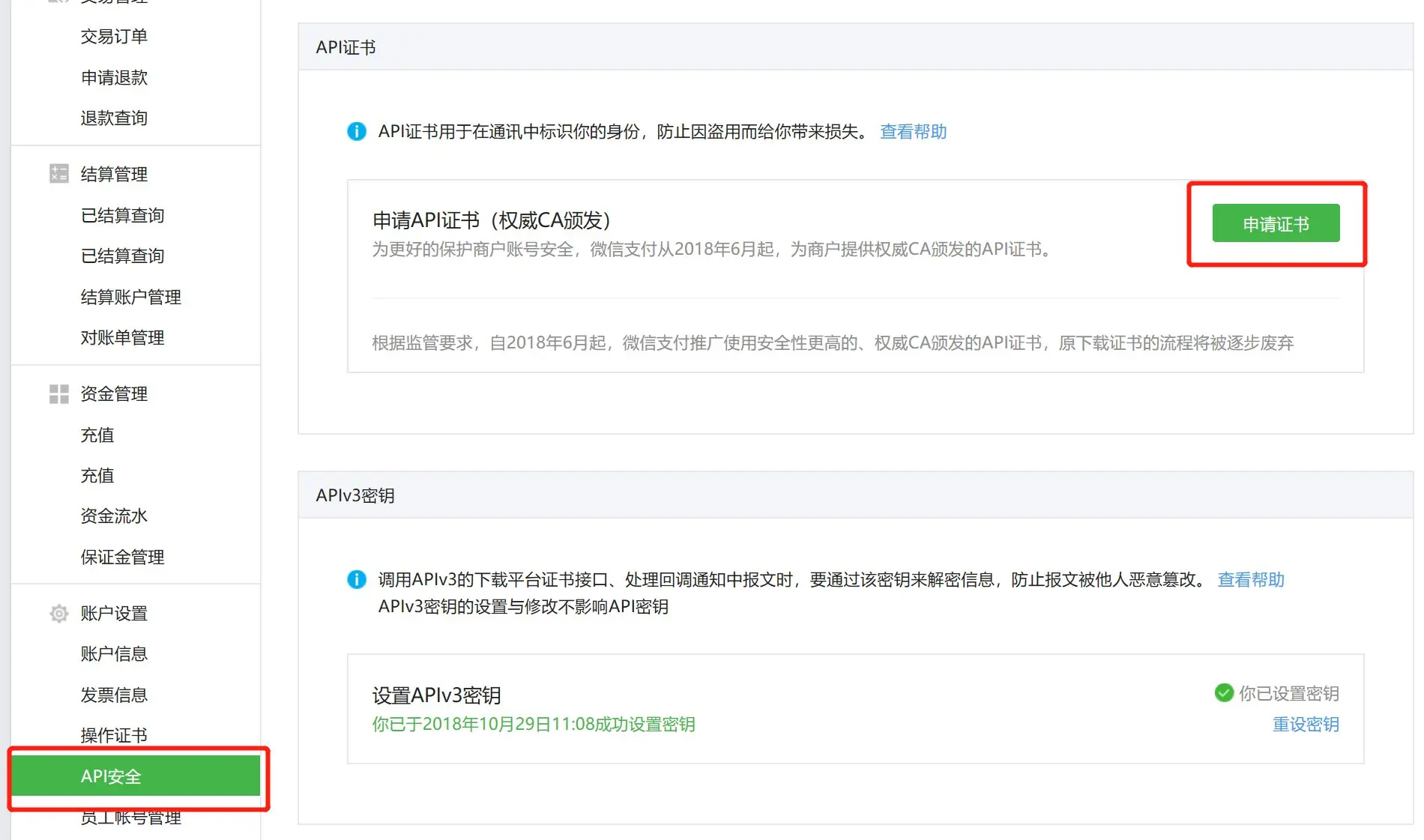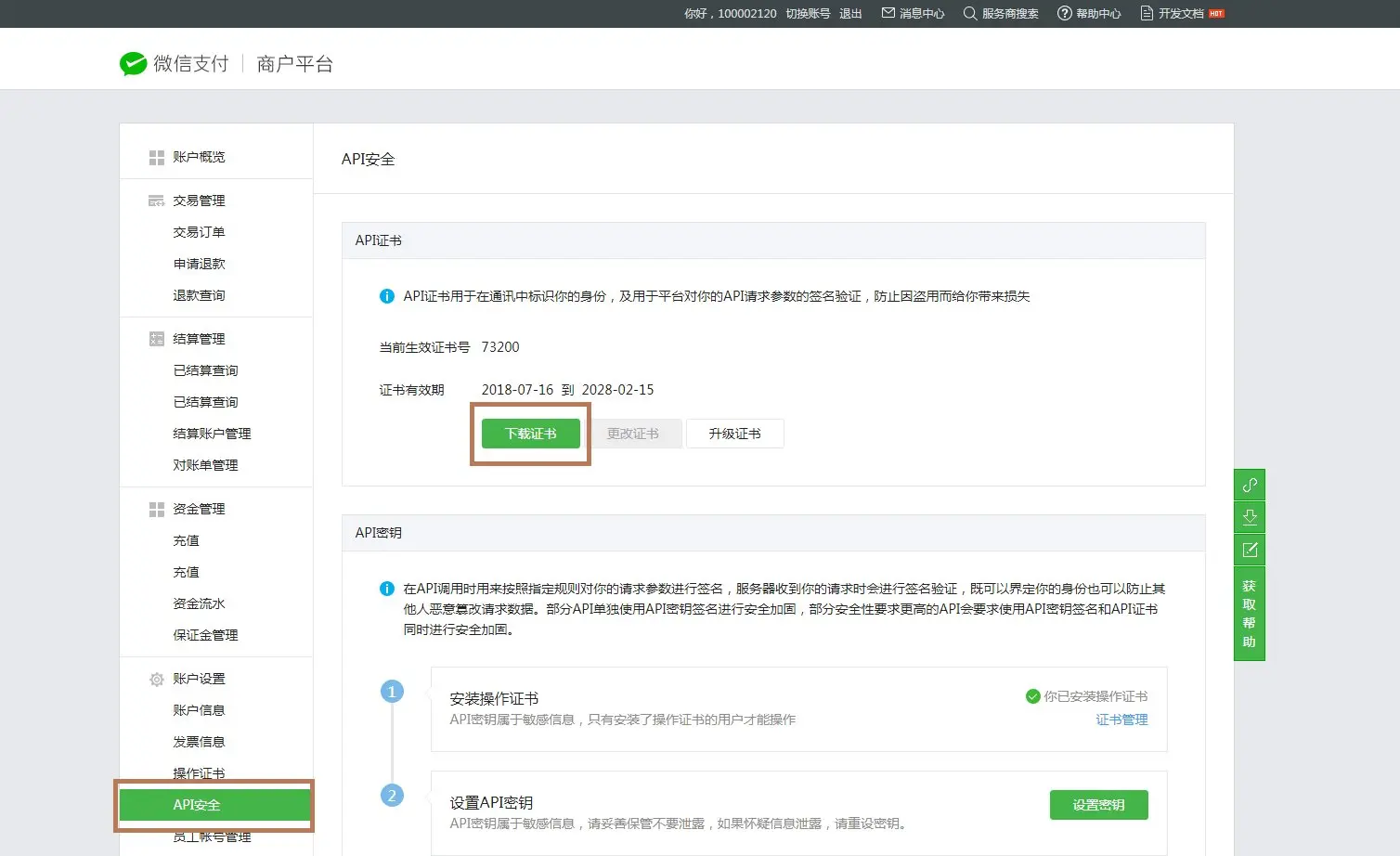 ## **如何获取API证书** ### </br>**获取API证书需要商户号的超级管理员才能操作,详细步骤如下:** </br>**1、登录微信支付商户平台,进入【账户中心】->【账户设置】->【API安全】** * **若页面效果如下图,表示你的证书类型为“微信支付颁发的API证书”,可点击“下载证书”按钮,并按页面指引操作即可。**  * **若页面效果如下图,表示你的证书类型为“权威CA颁发的API证书”,请点击“申请证书”按钮,并按以下指引完成证书申请。**  * **在【商户平台】打开【生成API证书】弹窗,点击“允许访问”,同意网页访问剪切板;**  * **在【商户平台】-“提交请求串”环节,点击“下载证书工具”按钮;** * **下载并打开文件“WXCertUtil.exe”后;** * **在【证书工具】,点击“申请证书”按钮,如下图:**  * **在【证书工具】-“填写商户信息”环节,填写商户号和商户名称后,点击“下一步”按钮,可在【商户平台】查看商户号和商户名称;**  * **在【证书工具】-“复制请求串”环节,点击“复制”按钮后;** * **在【商户平台】-“提交请求串”环节,在输入框粘贴请求串;** * **输入“短信验证码”和“登录密码”;** * **点击“下一步”进入【商户平台】-“复制证书串”环节;**  * **在【商户平台】-“复制证书串”环节,点击“复制证书串”按钮后;** * **在【证书工具】-“复制请求串”环节,点击“下一步”按钮进入粘贴证书串环节;** * **在【证书工具】-粘贴证书串环节,点击粘贴按钮后;** * **点击下一步”按钮,进入【证书工具】-生产证书环节**  * **在【证书工具】-“生成证书”环节,已完成申请证书流程,点击“查看证书文件夹”,查看已生成的证书文件。**  * **请将生成的证书文件转交给技术人员,由技术人员将证书部署到服务器上。** </br>**最后,请悉知,此处敲黑板!** **请务必妥善保管证书及私钥,因为私钥文件只能通过证书工具导出,若私钥丢失,则无法找回;** ## </br>**如何更换和作废API证书(权威CA颁发)?API证书的私钥丢失了怎么办?** **更换和作废API证书(权威CA颁发)+API证书的私钥丢失**:https://kf.qq.com/faq/1808302quyqi180830EjANrq.html