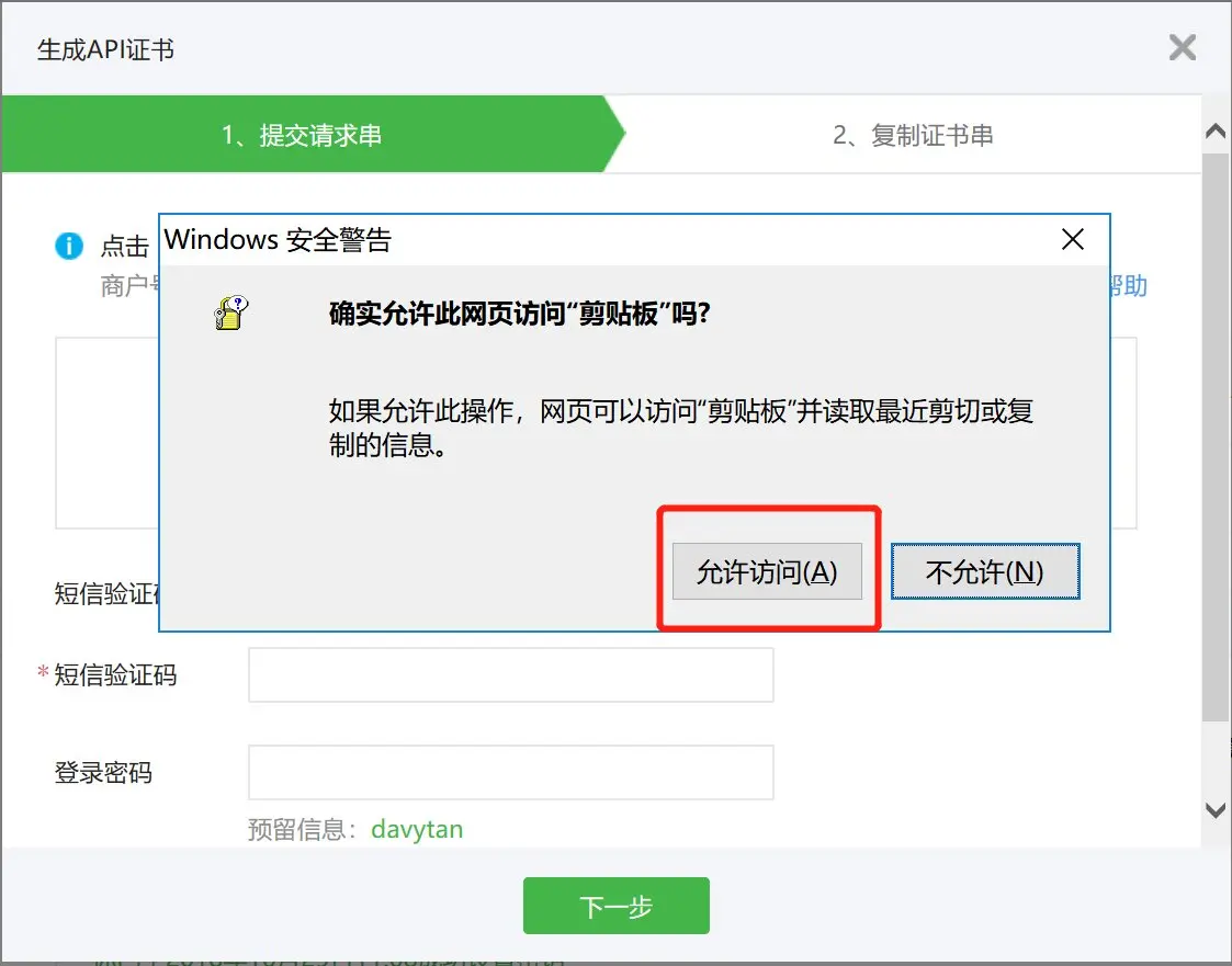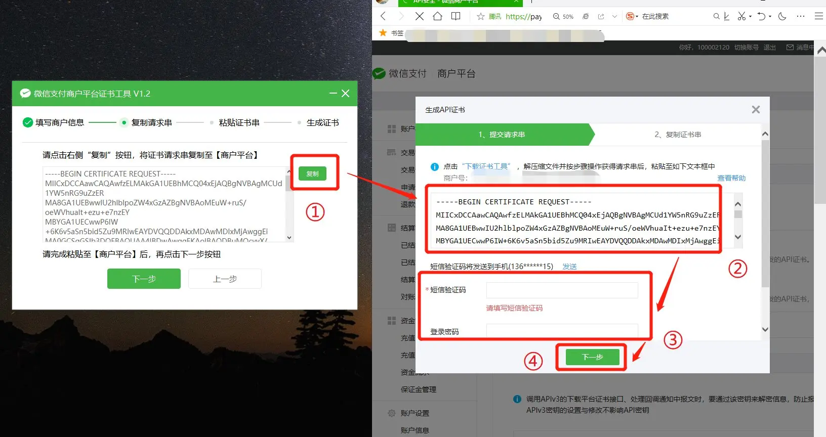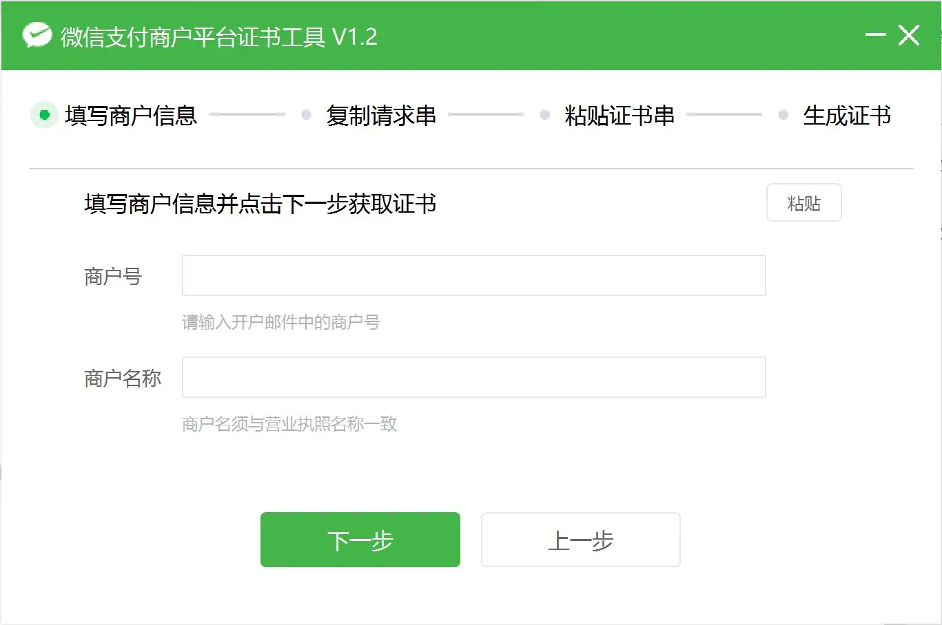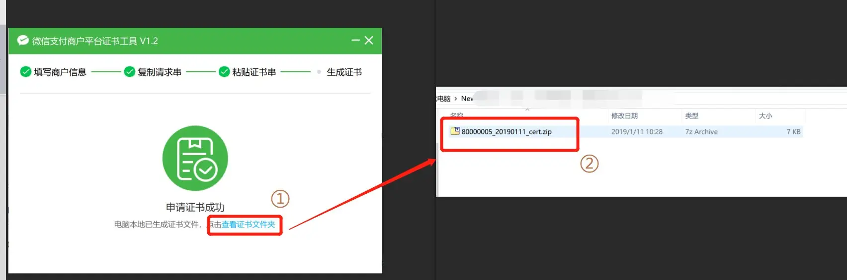 ## **如何获取API证书** ### </br>**获取API证书需要商户号的超级管理员才能操作,详细步骤如下:** </br>**1、登录微信支付商户平台,进入【账户中心】->【账户设置】->【API安全】** * **若页面效果如下图,表示你的证书类型为“微信支付颁发的API证书”,可点击“下载证书”按钮,并按页面指引操作即可。**  * **若页面效果如下图,表示你的证书类型为“权威CA颁发的API证书”,请点击“申请证书”按钮,并按以下指引完成证书申请。**  * **在【商户平台】打开【生成API证书】弹窗,点击“允许访问”,同意网页访问剪切板;**  * **在【商户平台】-“提交请求串”环节,点击“下载证书工具”按钮;** * **下载并打开文件“WXCertUtil.exe”后;** * **在【证书工具】,点击“申请证书”按钮,如下图:**  * **在【证书工具】-“填写商户信息”环节,填写商户号和商户名称后,点击“下一步”按钮,可在【商户平台】查看商户号和商户名称;**  * **在【证书工具】-“复制请求串”环节,点击“复制”按钮后;** * **在【商户平台】-“提交请求串”环节,在输入框粘贴请求串;** * **输入“短信验证码”和“登录密码”;** * **点击“下一步”进入【商户平台】-“复制证书串”环节;**  * **在【商户平台】-“复制证书串”环节,点击“复制证书串”按钮后;** * **在【证书工具】-“复制请求串”环节,点击“下一步”按钮进入粘贴证书串环节;** * **在【证书工具】-粘贴证书串环节,点击粘贴按钮后;** * **点击下一步”按钮,进入【证书工具】-生产证书环节**  * **在【证书工具】-“生成证书”环节,已完成申请证书流程,点击“查看证书文件夹”,查看已生成的证书文件。**  * **请将生成的证书文件转交给技术人员,由技术人员将证书部署到服务器上。** </br>**最后,请悉知,此处敲黑板!** **请务必妥善保管证书及私钥,因为私钥文件只能通过证书工具导出,若私钥丢失,则无法找回;** ## </br>**如何更换和作废API证书(权威CA颁发)?API证书的私钥丢失了怎么办?** **更换和作废API证书(权威CA颁发)+API证书的私钥丢失**:https://kf.qq.com/faq/1808302quyqi180830EjANrq.html