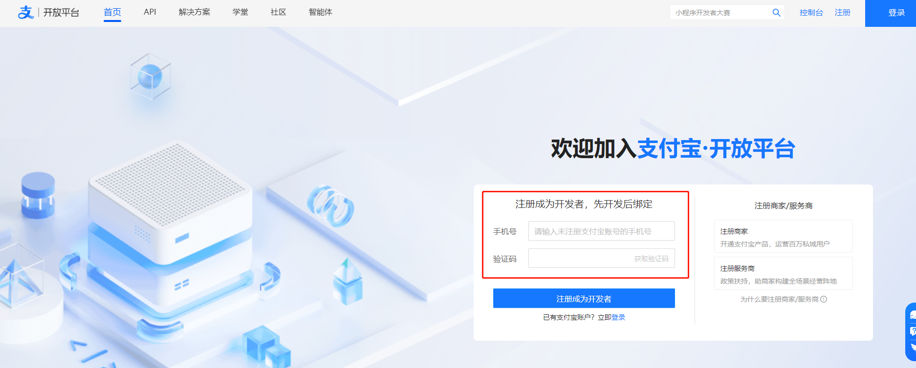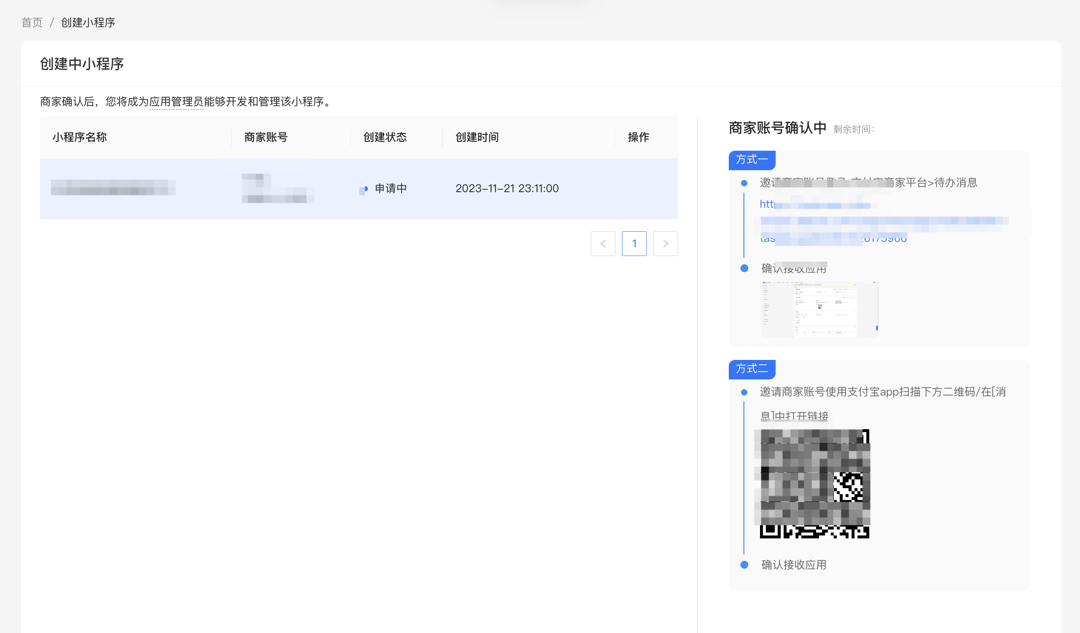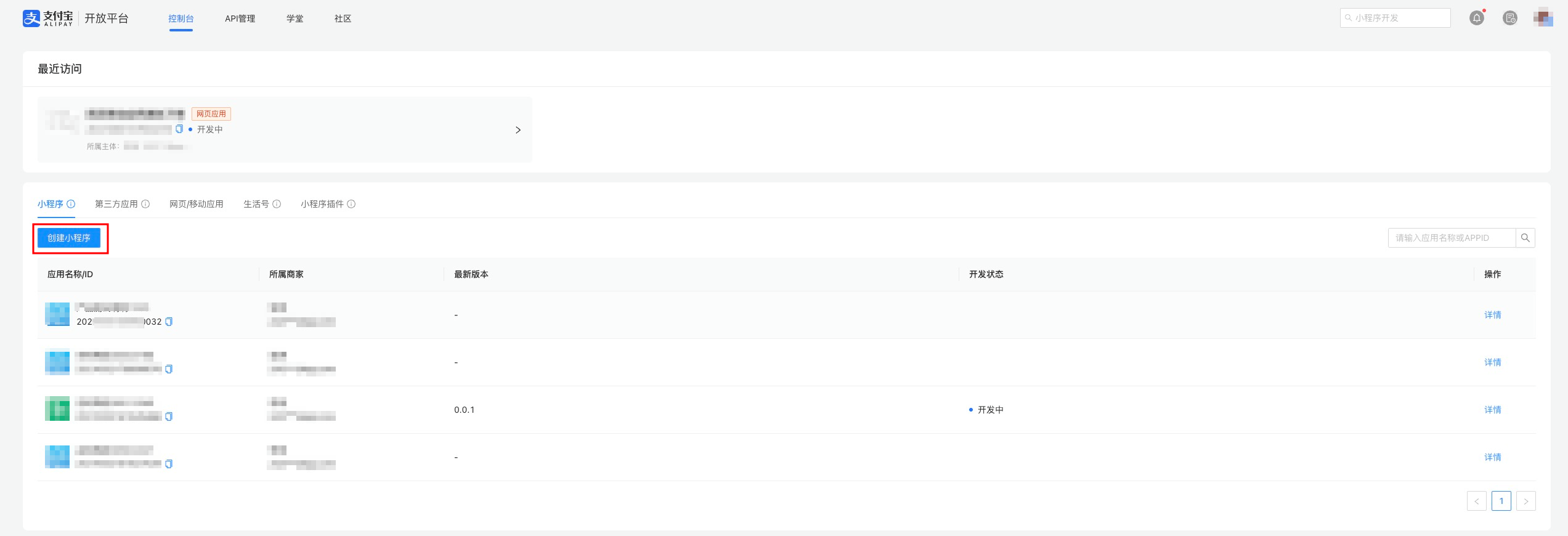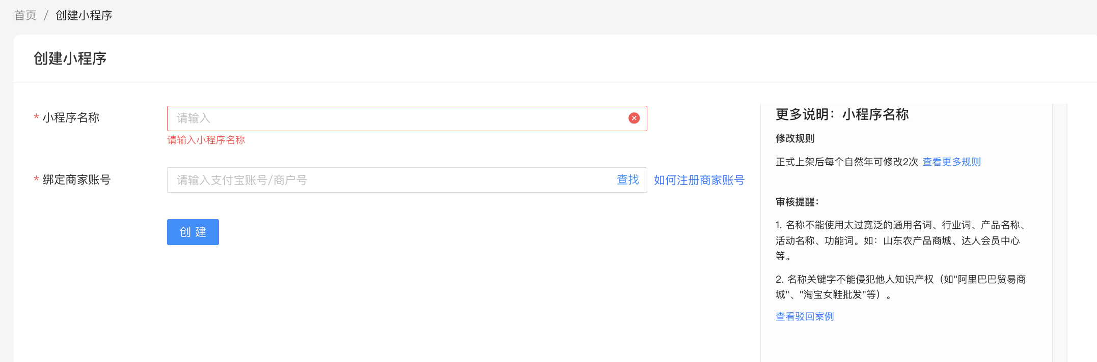 **可参考支付宝小程序注册的官方文档:https://opendocs.alipay.com/mini/introduce/create?pathHash=a4aca438** ### 1、注册开发者账号 开发者登录 支付宝开放平台(https://open.alipay.com/),点击注册,进入注册页面。 输入手机号,注册成为开发者 提示: 如果已经有支付宝账号,点击 立即登录 ,使用支付宝账号登录开放平台。 如果没有支付宝账号,可以使用手机号注册成为开发者。   ### 2、创建小程序 登录开放平台控制台,点击页面左上角-创建小程序,进入创建小程序页面。  #### 在创建小程序页面,填写小程序名称。  #### 在绑定商家账号输入框,输入商家支付宝账号/商户号,点击查找,确认账号后发起创建。  #### 发起创建申请后,邀请商家账号点击链接或扫描二维码确认待办。创建中的小程序可在控制台-创建小程序旁点击进入。  **注意:如果是以下情况,小程序可以直接创建成功,不需要商家账号确认。 ① 您(小程序创建人)绑定当前登录账号。 ② 您(小程序创建人)为绑定主体账号的管理员。** 创建成功后,即可在控制台小程序列表看到此应用,并进行开发。  **说明: ① 每个支付宝账号最多可以创建10个小程序。 ② 未曾提交审核的小程序可以删除,删除之后不计入总数。 ③ 如在创建小程序时发现名称已被占用,请更换名称或联系 4007585858 处理。 ④ 绑定成功后不可解绑或移交。 ⑤ 经商家审批并创建成功后,您会成为小程序的应用管理员,继续开发小程序。具体权限可查看成员管理。**