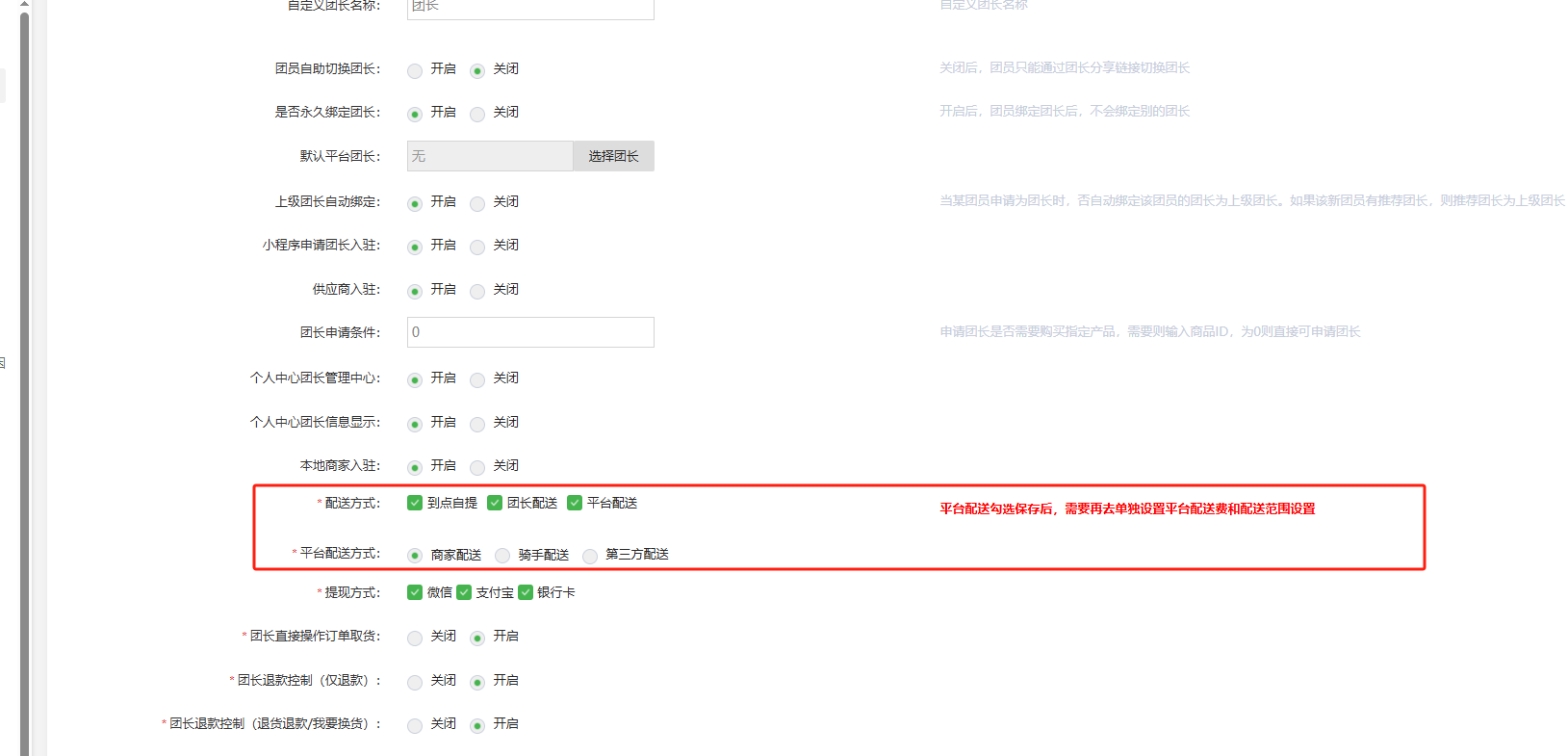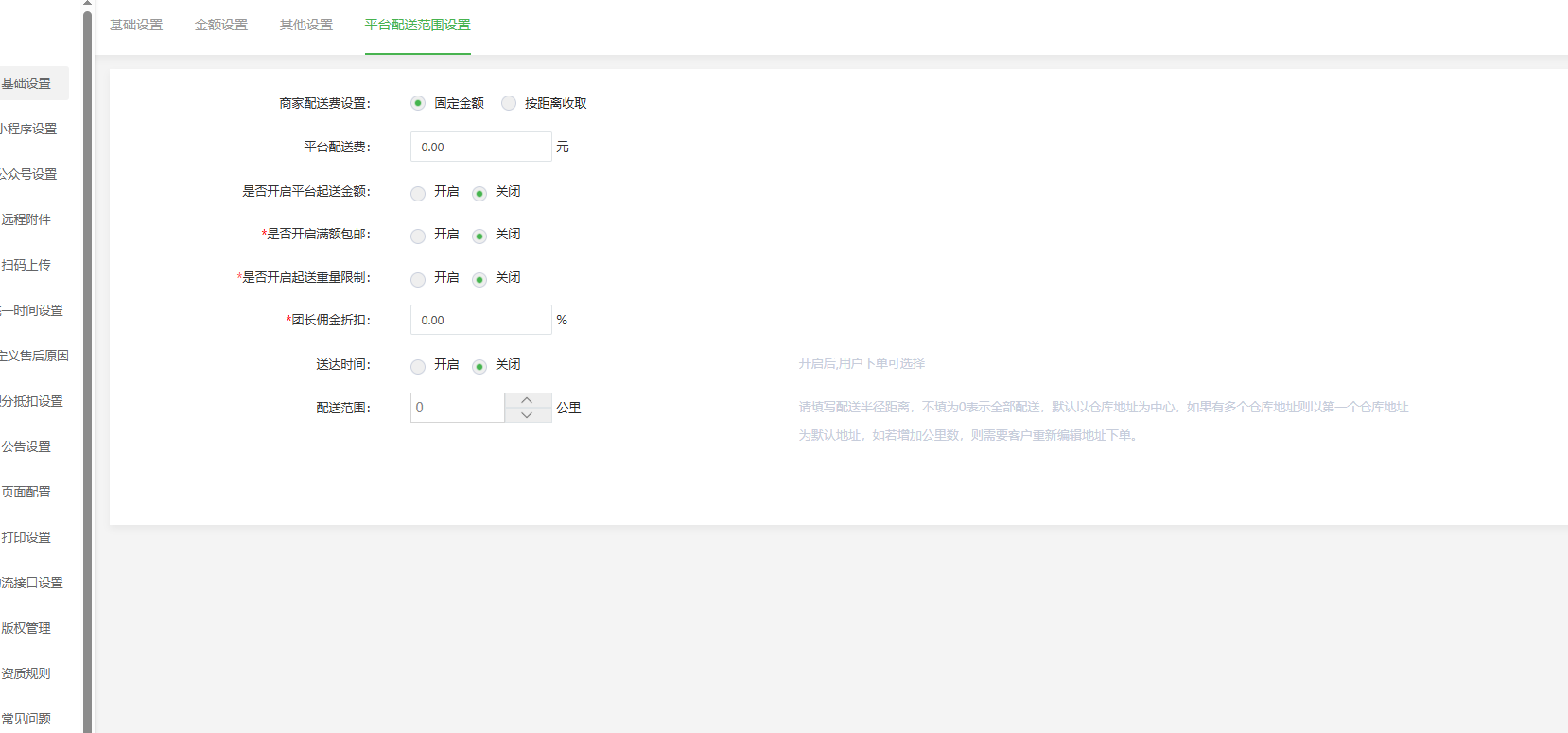 ### 基础设置-平台配送设置 #### 配送方式选择:平台配送-商家配送,需要再去单独设置平台配送费和配送范围设置